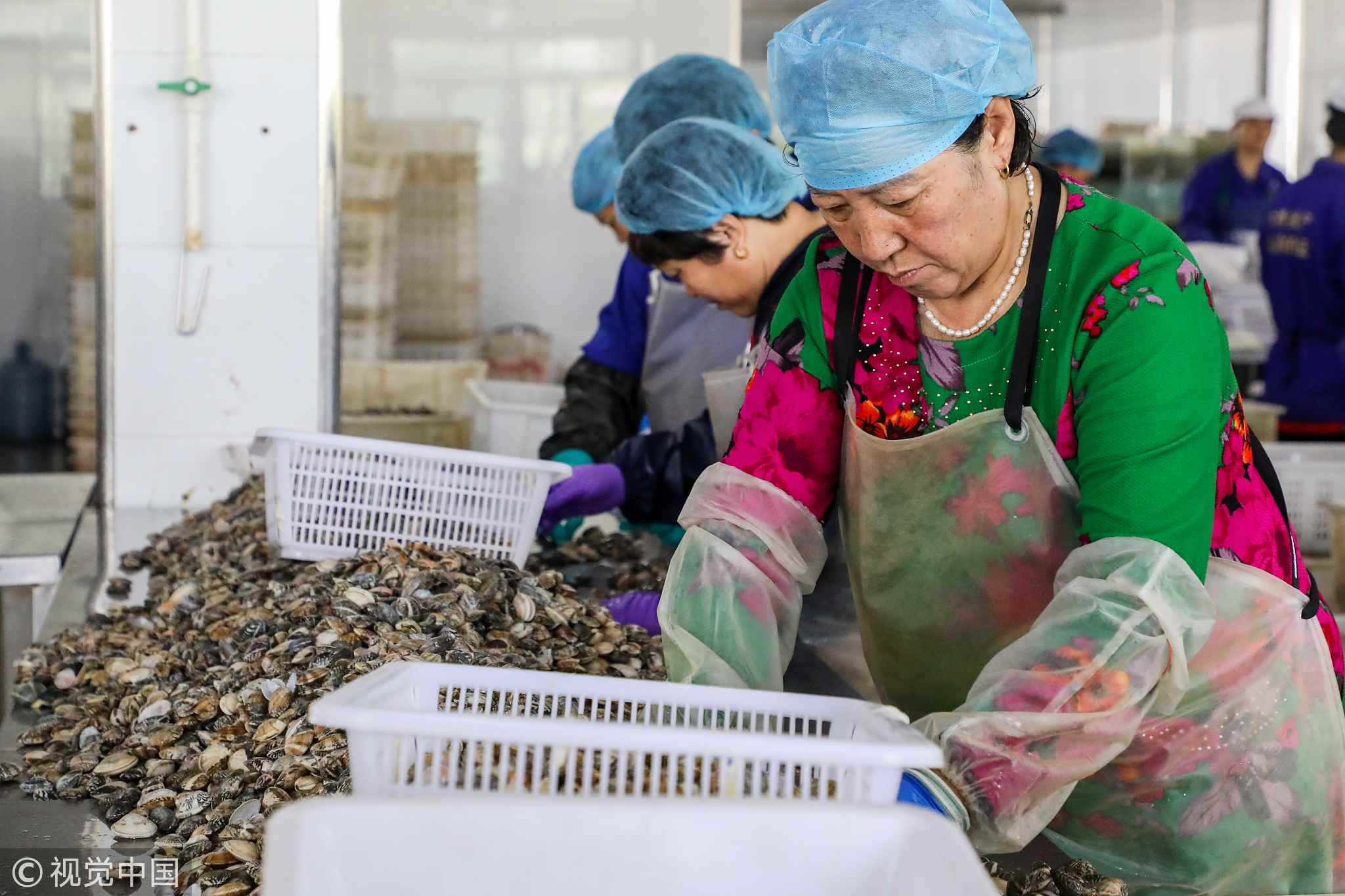 Women aged around 60 are processing clams in Dadong City, northeast China's Liaoning Province, June 9, 2017. /VCG Photo