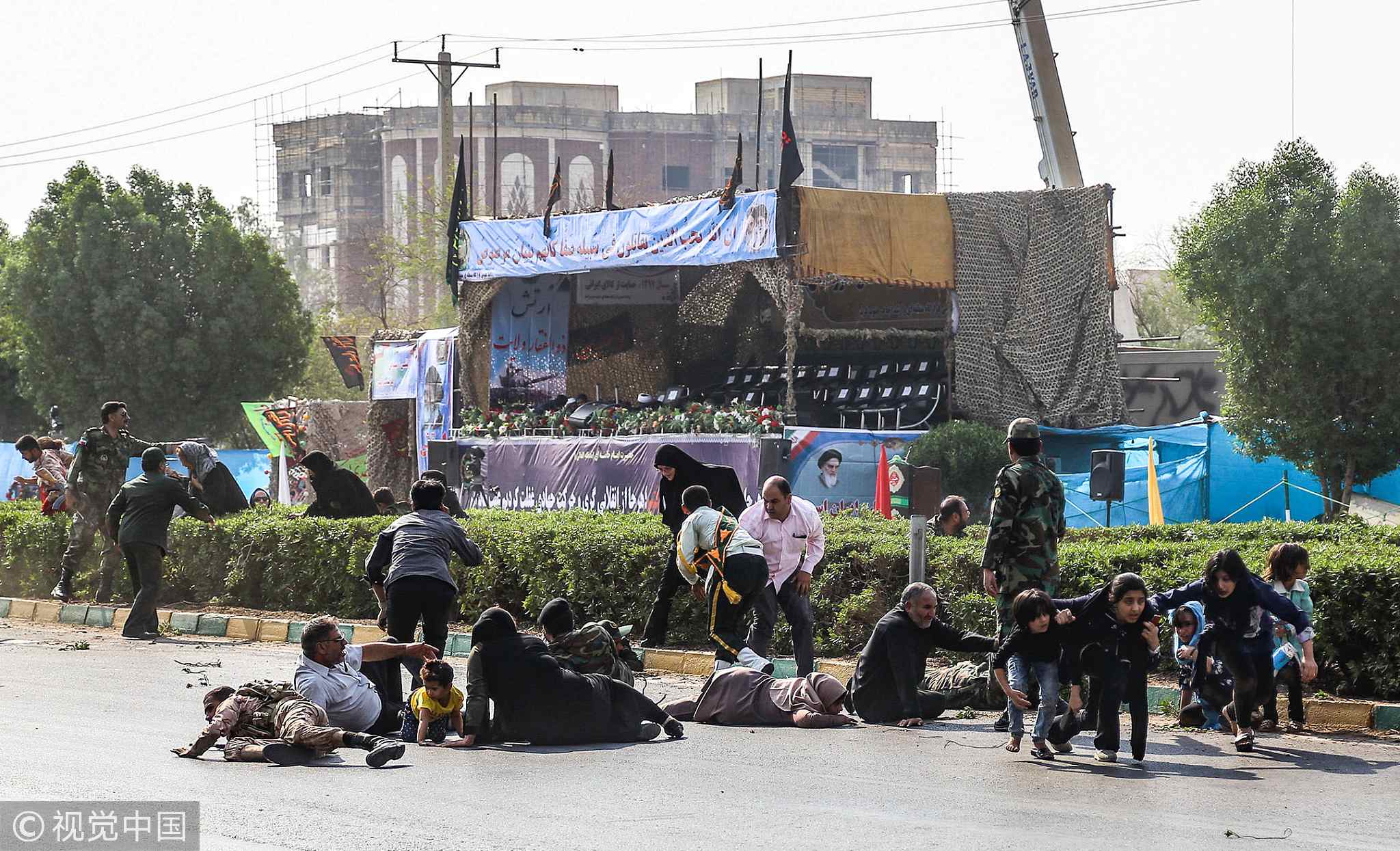 Iranian men, women and children lie on the ground, awhile others seek cover at the scene of an attack on a military parade on September 22, 2018. /VCG Photo