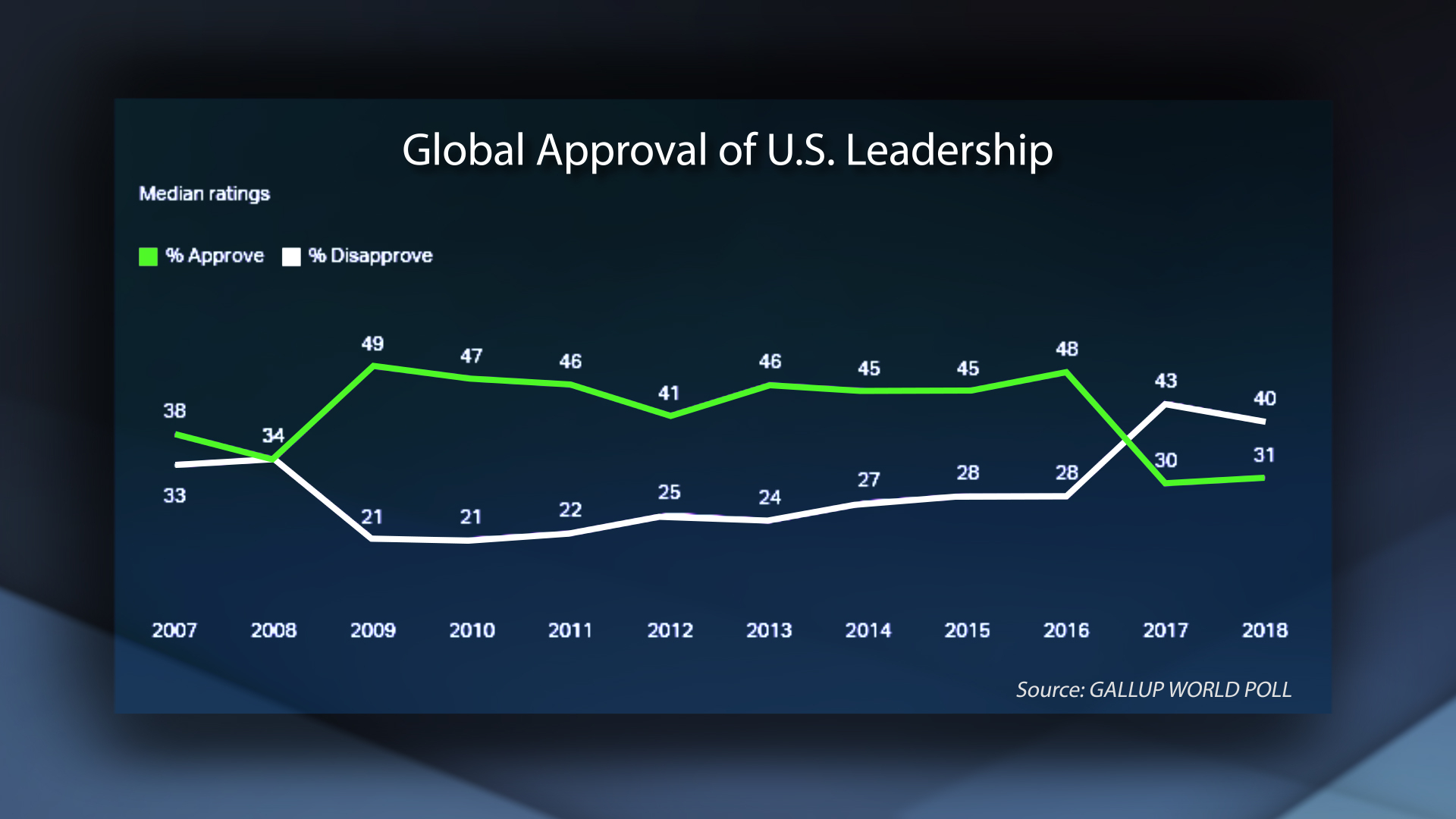 The survey, conducted since 2007, measures to what extent adults approve or disapprove of the job performance of the leadership of China, Germany, Russia and the U.S. Results are based on in-person and telephone interviews with about 1,000 people in each of the 133 countries polled.