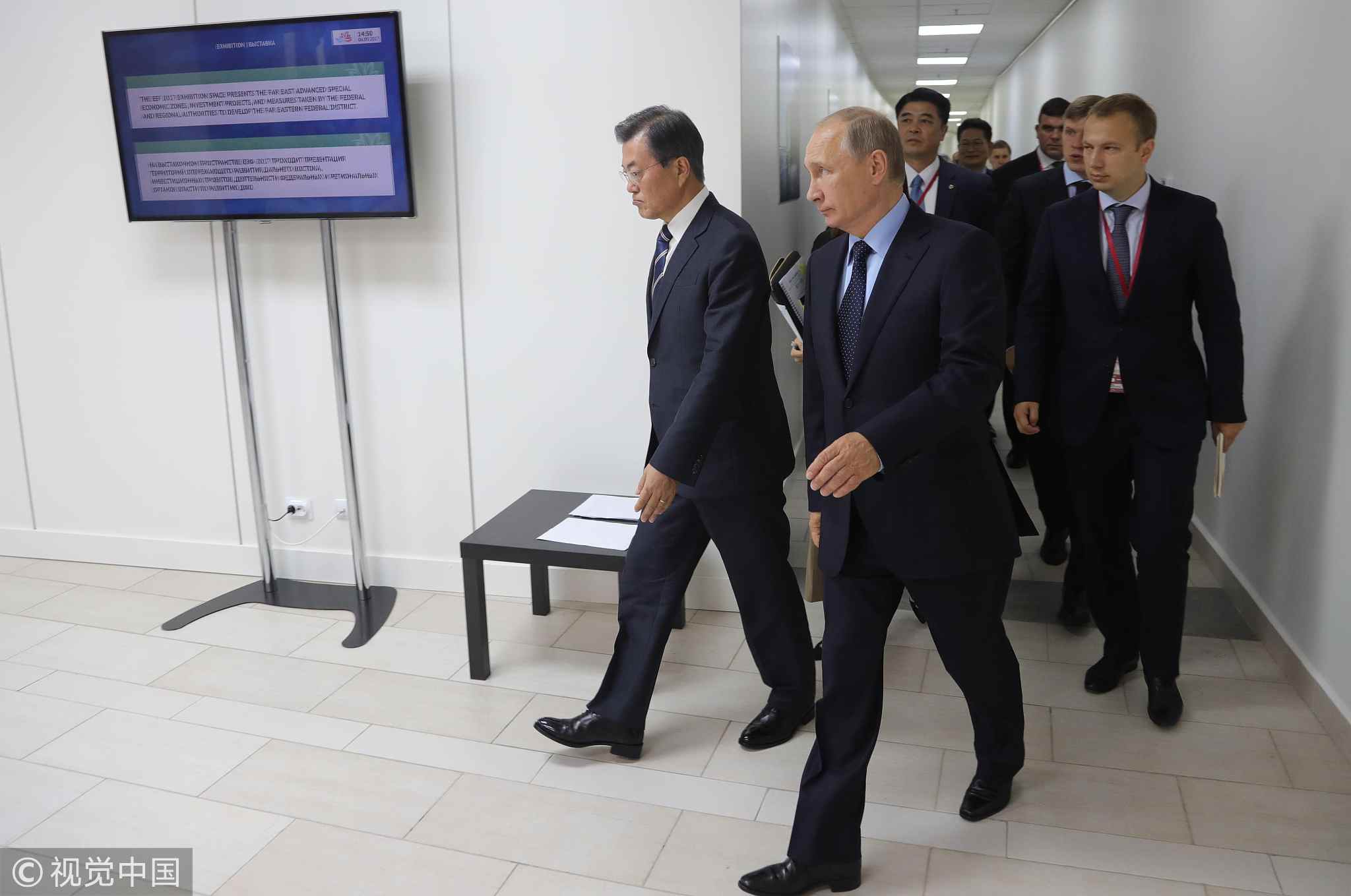 Russian President Vladimir Putin and President of the ROK Moon Jae-in leave after a meeting as part of the 3rd Eastern Economic Forum hosted by the Far Eastern Federal University at Russky Island outside Vladivostok, September 6, 2017. /VCG Photo
