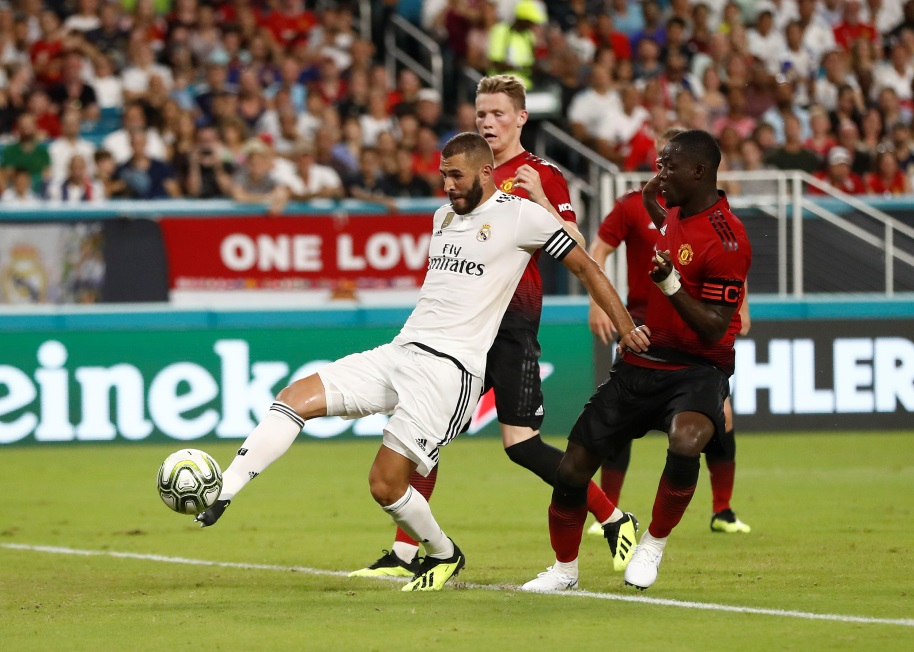 Real Madrid's Karim Benzema fends off two Manchester United players before scoring his team's only goal during Tuesday night's match in Miami, Florida, July 31, 2018. /VCG Photo