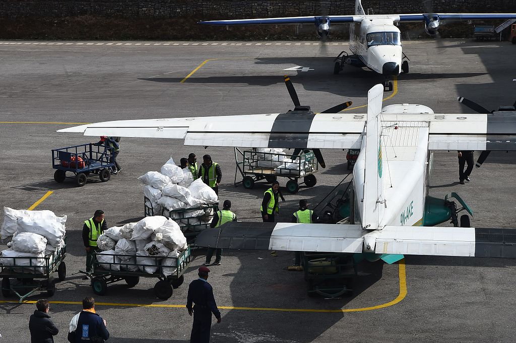 Nepali airline staff load waste collected from the Everest region at Lukla Airport, the gateway to the area, in Lukla on March 17, 2018, before it is transported to Kathmandu to be recycled./ VCG Photo