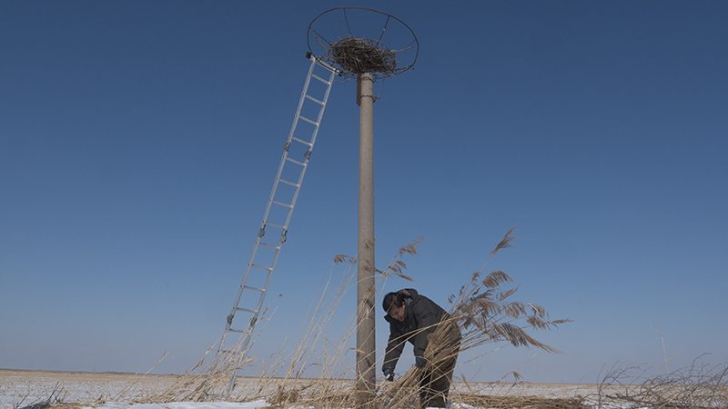 Fu is making artificial nests for oriental white storks in winter, as it’s easier to work on wetlands while it is frozen.