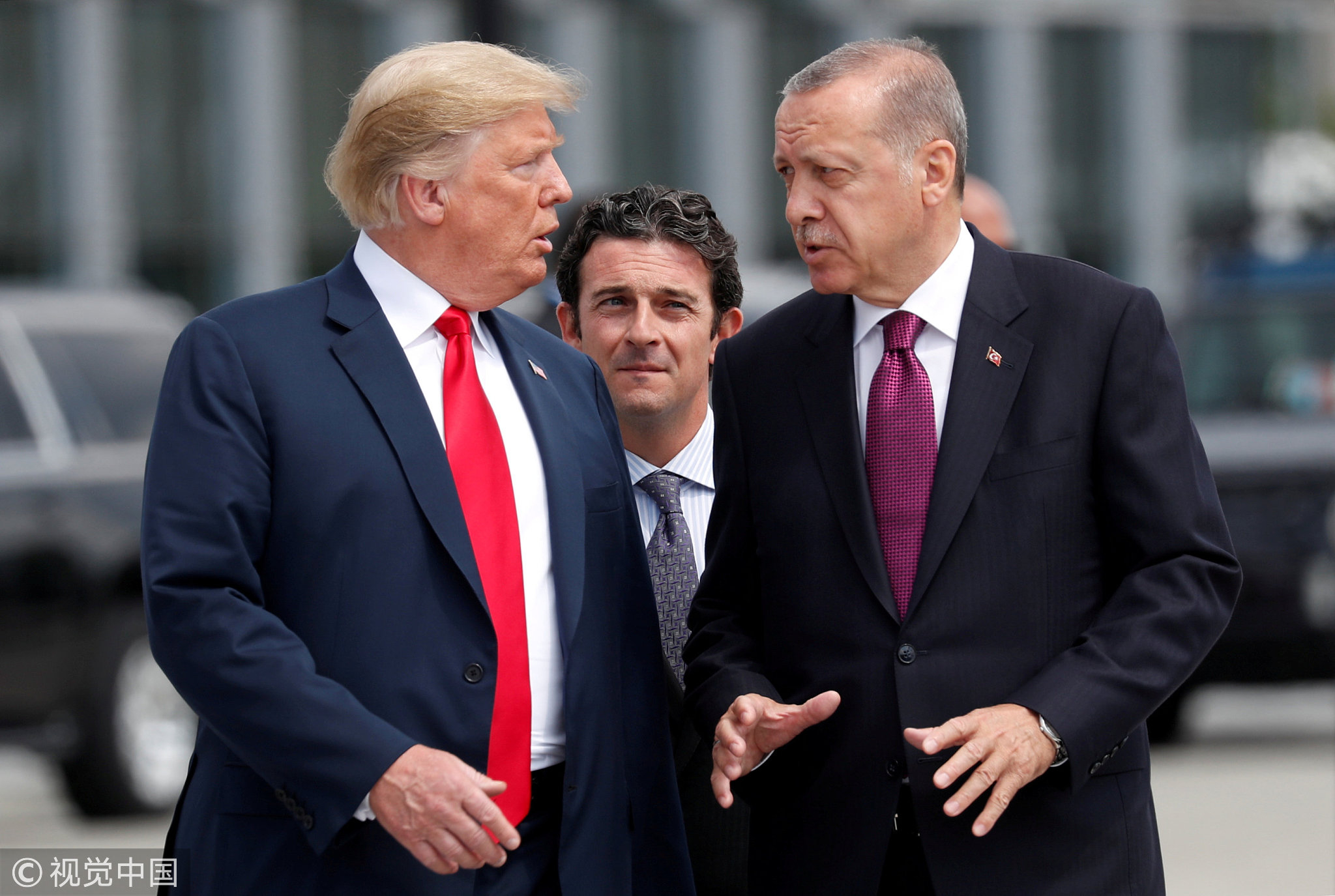 US President Donald Trump and Turkish President Tayyip Erdogan talk at the start of the NATO summit in Brussels, July 11, 2018. /VCG Photo