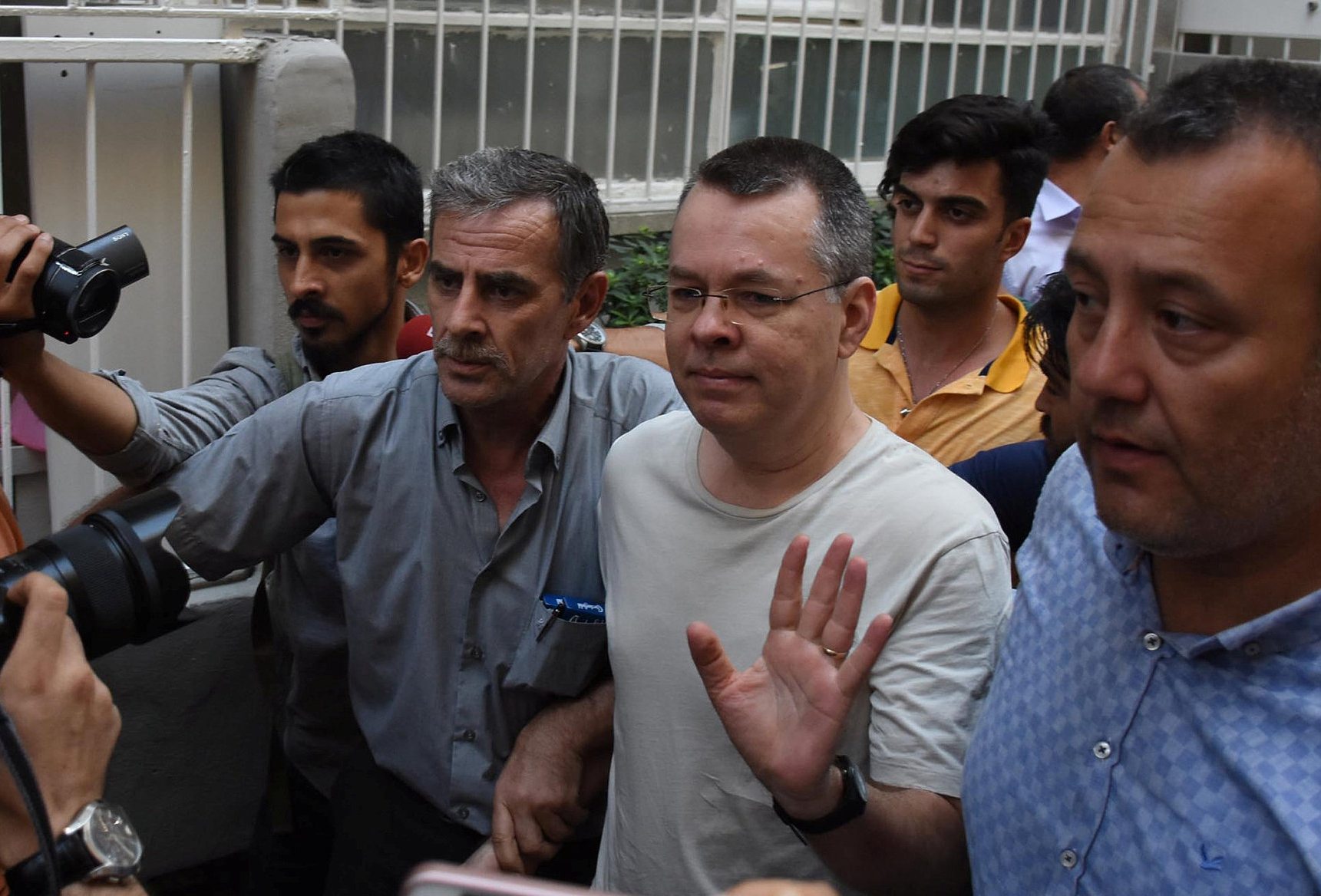 US pastor Andrew Brunson reacts as he arrives at his home after being released from prison in Izmir, Turkey, July 25, 2018. /VCG Photo
