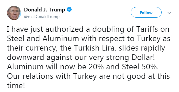 In a tweet, Trump announced the doubling of the tariffs in new punitive actions against Turkey, saying, "Our relations with Turkey are not good at this time!"