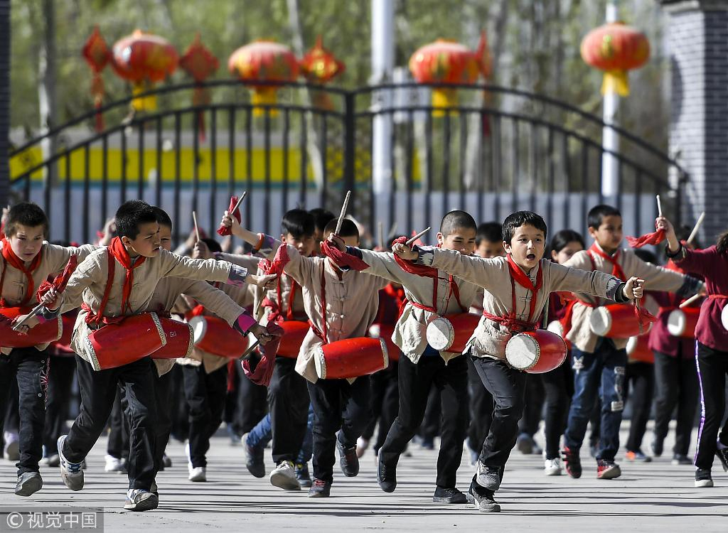 Students from a primary school in Wushi County, in northwest China's Xinjiang Uygur Autonomous Region, were seen learning traditional Chinese art on Monday. /VCG Photo