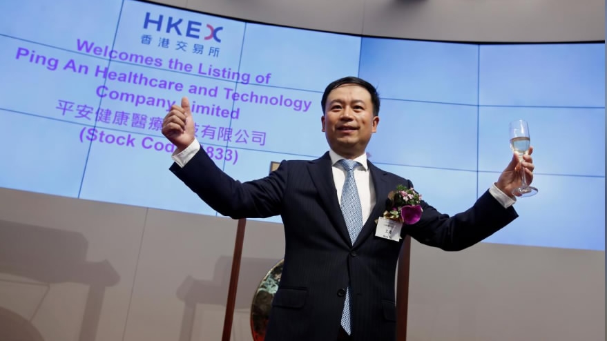 Ping An Healthcare and Technology Co Ltd Chairman and CEO Wang Tao poses during the listing of the company at the Hong Kong Exchanges in Hong Kong, China, May 4./Reuters Photo
