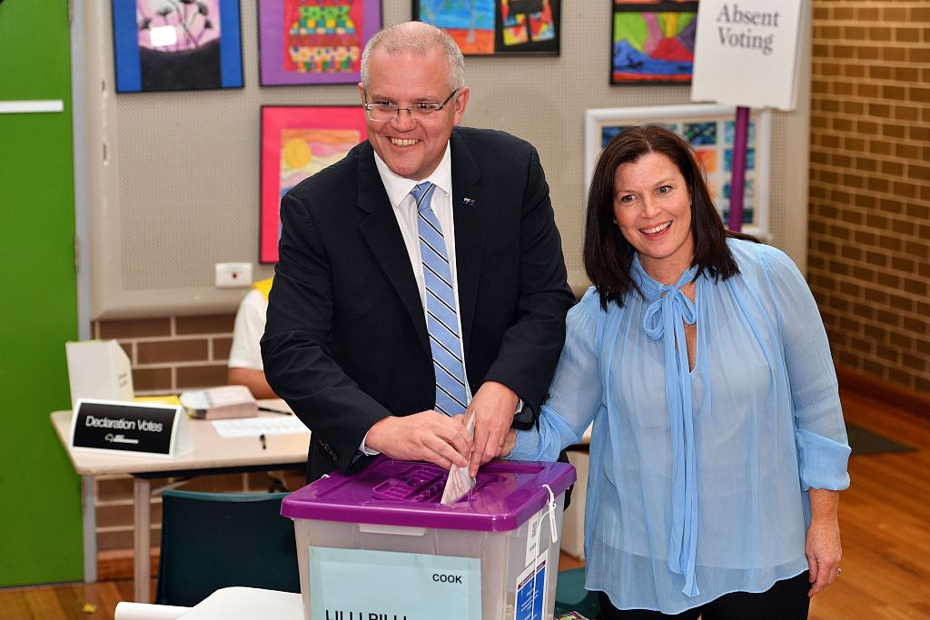 Australia's Prime Minister Scott Morrison and his wife cast their vote during Australia's general election in Sydney, May 18, 2019. /VCG Photo
