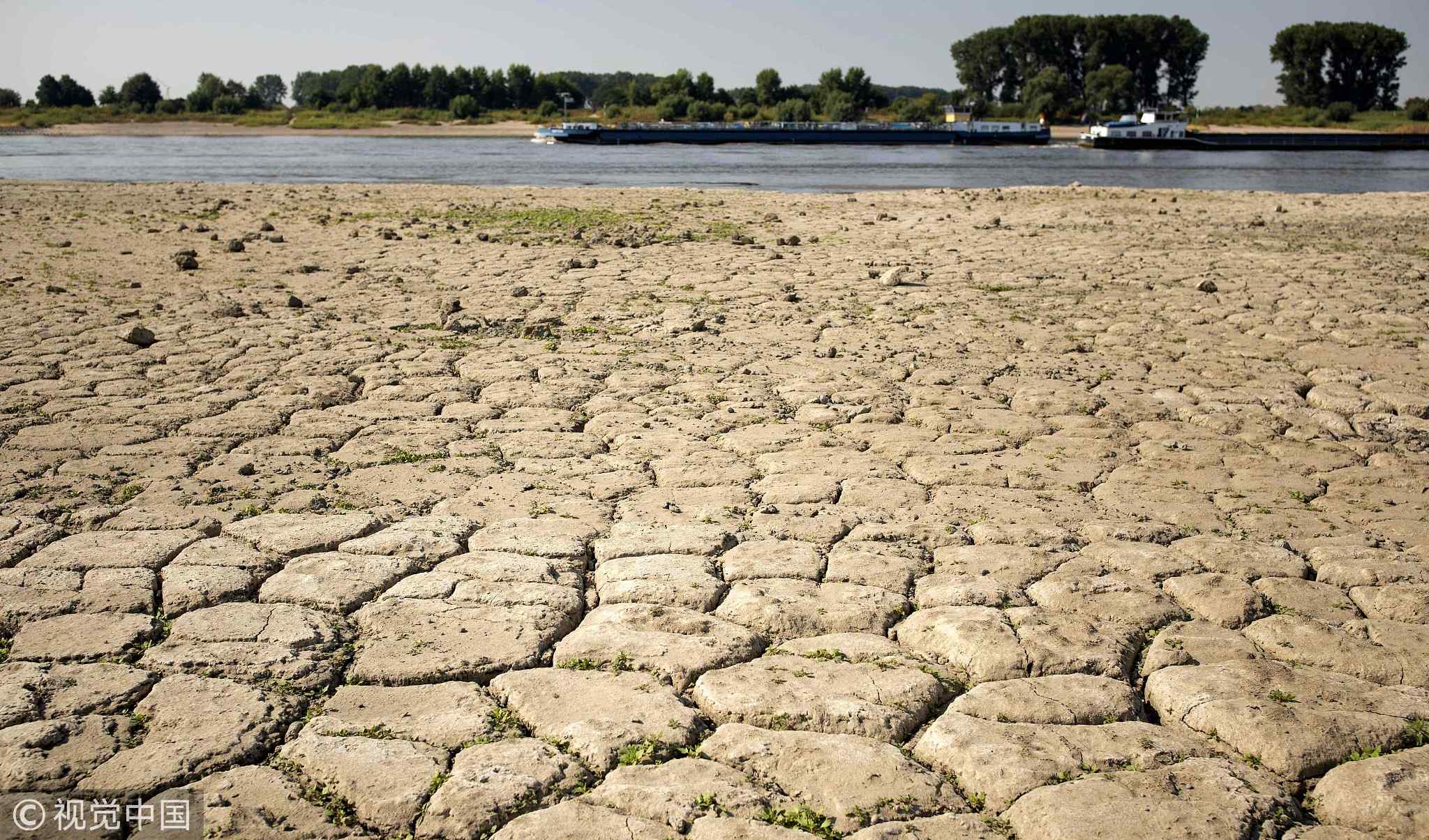 River barges travel past parched earth on the banks of the River Rhine in Lobith, Netherlands, on August 2, 2018, as heatwave conditions prevail over northern Europe. /VCG Photo