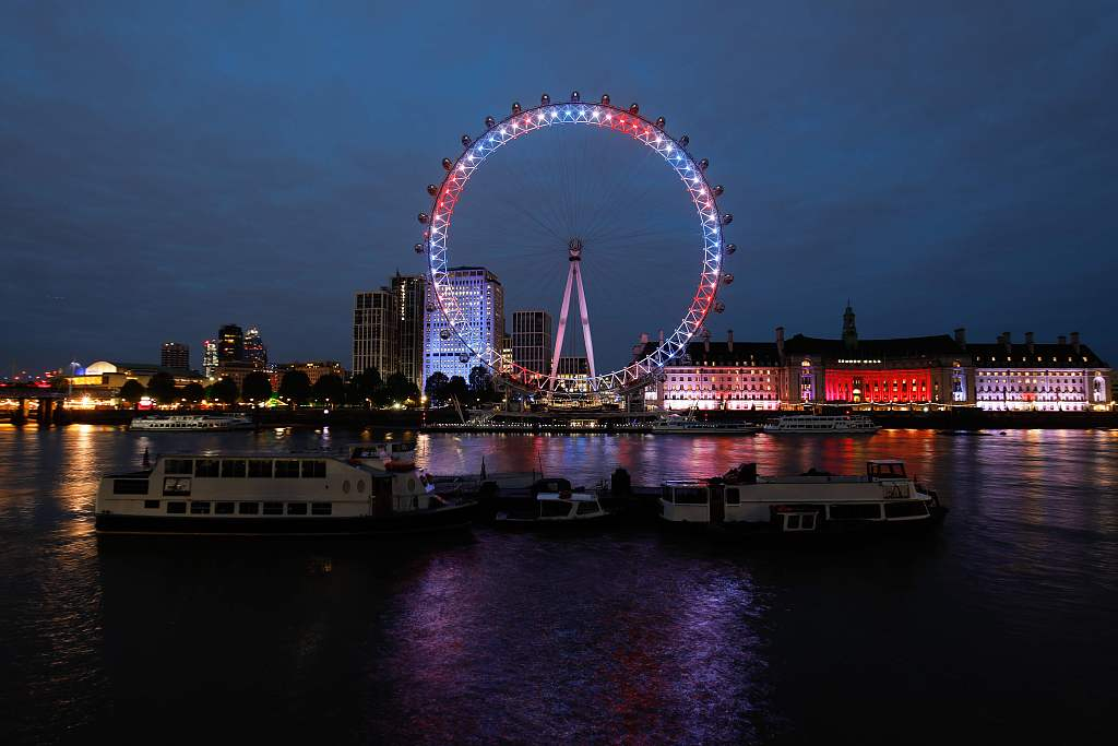 Lighting up the night sky over River Thames, the three colors represent the patriotic combination of the UK's Union flag. /VCG Photo