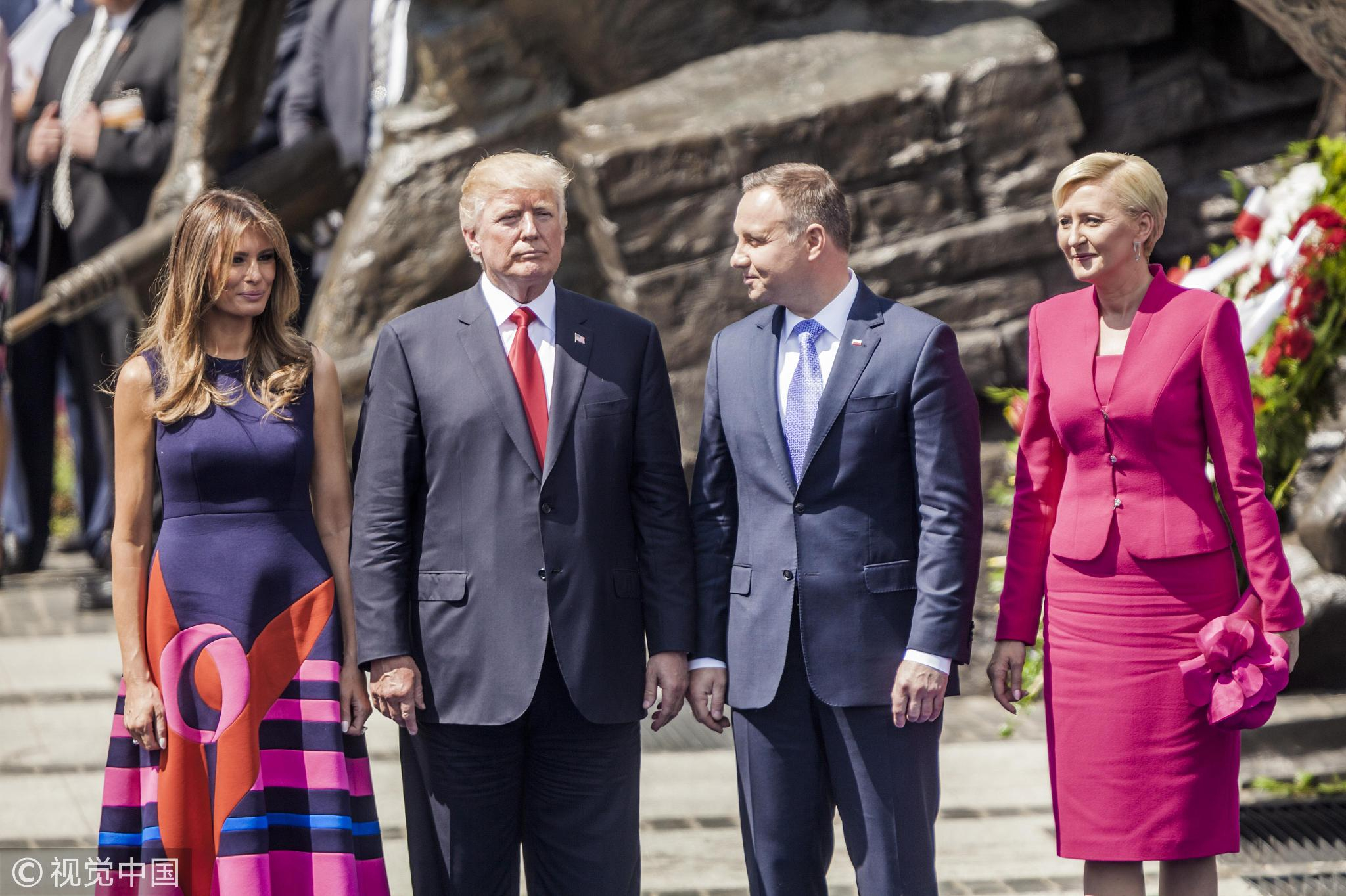 US President Donald Trump and First Lady of the US Melania Trump, with Polish President Andrzej Duda and First Lady of Poland Agata Agata Kornhauser-Duda, at Krasinski Square, near the Warsaw Uprising Monument, July 6, 2017, in Warsaw, Poland. /VCG Photo