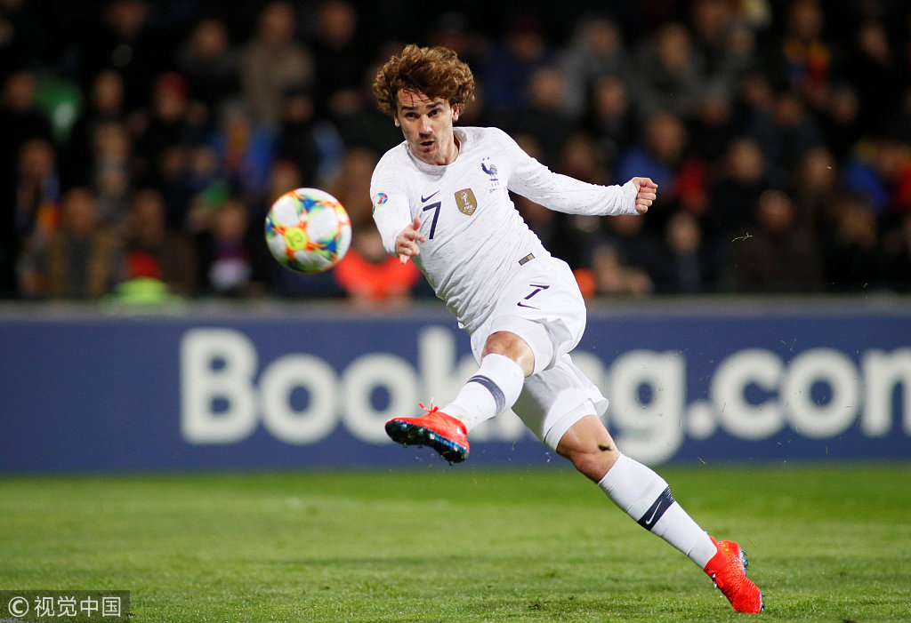 Atletico Madrid forward Antoine Griezmann scores the opening goal for France. /VCG Photo