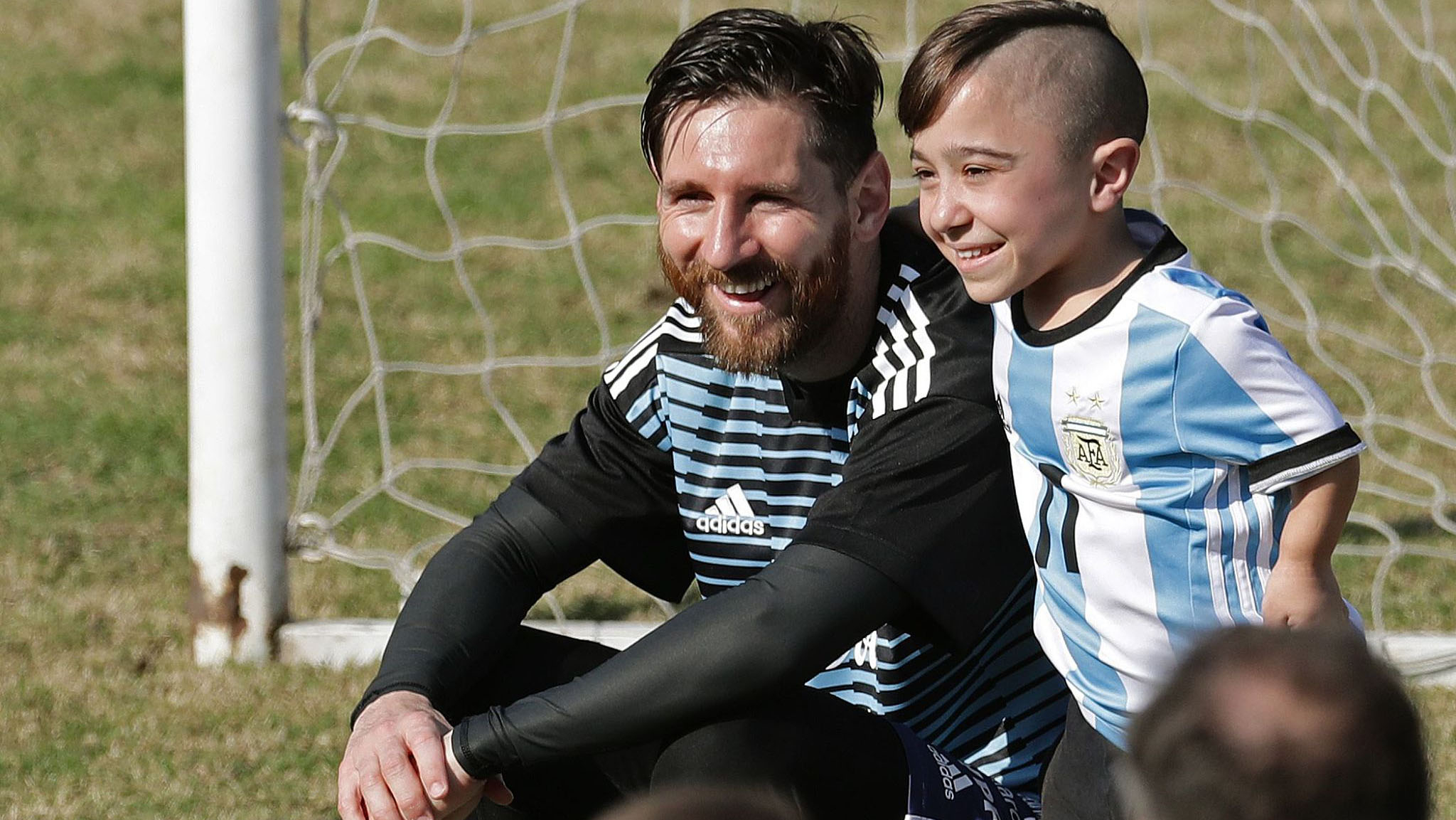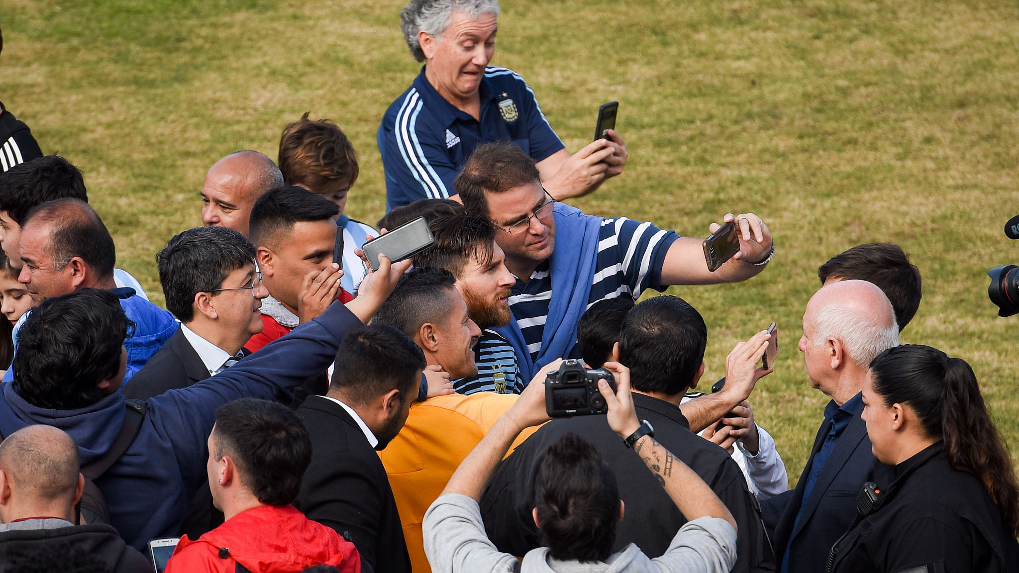 Argentina's national football team forward Lionel Messi poses with a fan during a training session at the Tomas Duco stadium in Buenos Aires on May 27, 2018 ahead of the FIFA World Cup. /VCG Photo