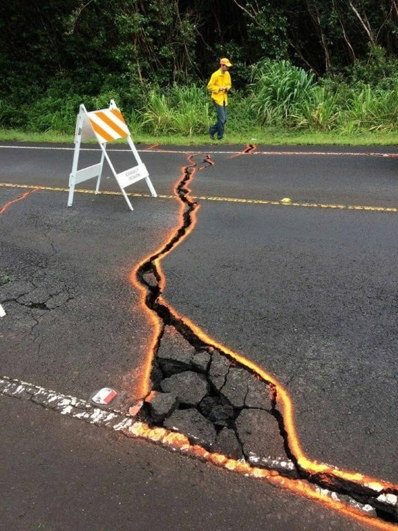 Cracks in Highway 130 outlined in orange at Leilani Estates, Hawaii. /AFP Photo