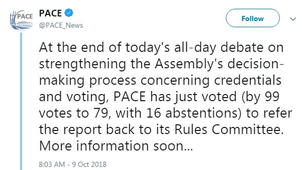 However, PACE rapporteur Petra de Sutter motioned for the draft resolution to be sent back to the Rules Committee in light of a profoundly divided Assembly at the conclusion of the debate.