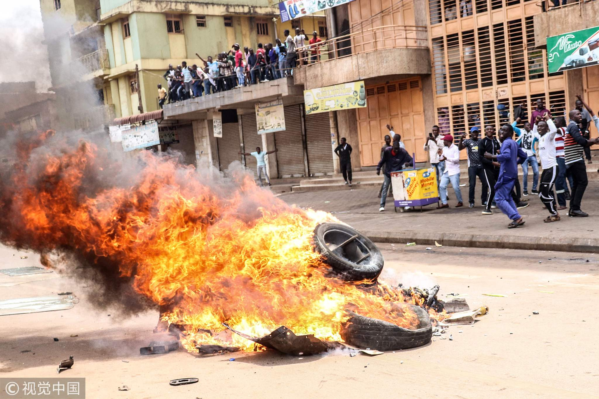 Protesters set a bonfire on a street to demand the release of the country's politicians that were arrested for treason and possession of firearms in Kampala, Uganda, August 20, 2018. /VCG Photo