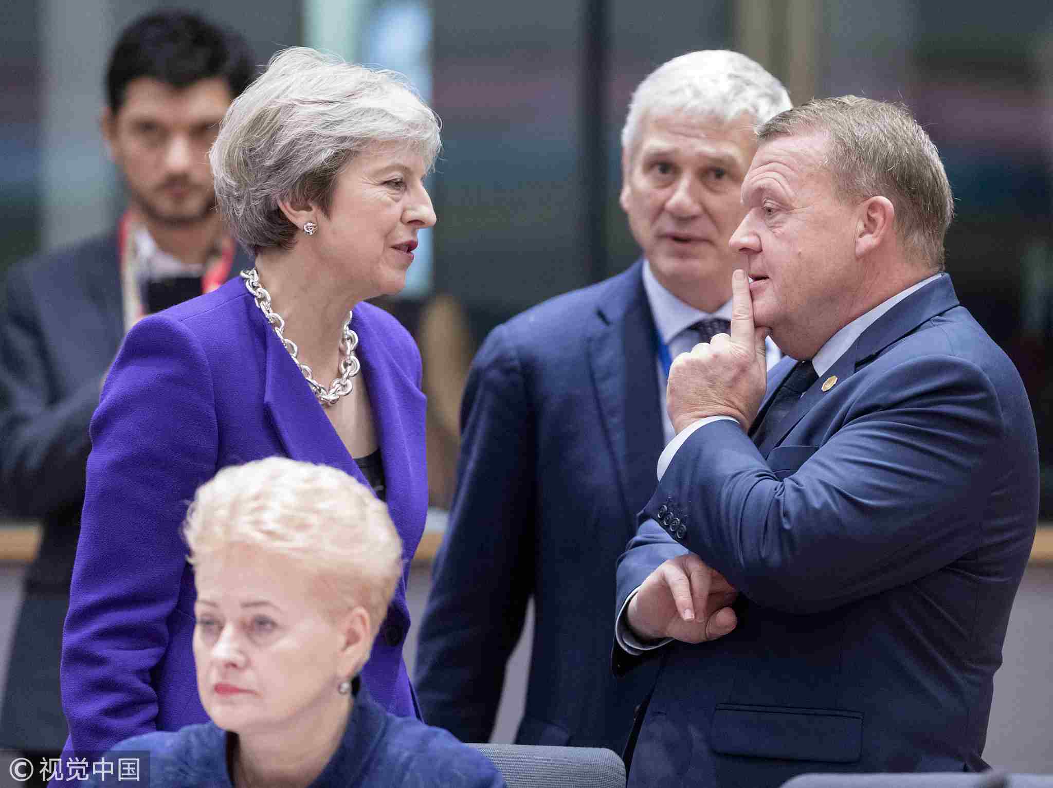 Prime Minister of the United Kingdom Theresa May (L) is talking with the Danish Prime Minister Lars Lokke Rasmussen (R) and the Lithuanian President Dalia Grybauskaite (sitting) during an EU chief of state summit in the Europa, the EU Council headquarter on October 18, 2018, in Brussels, Belgium. /VCG Photo