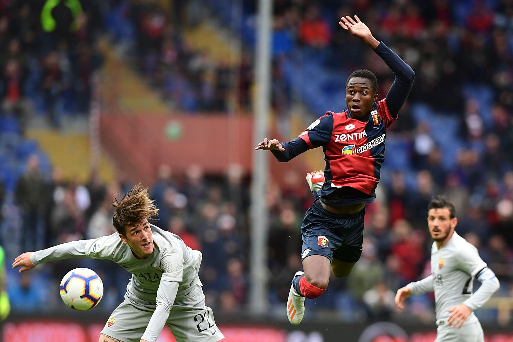 Nicolo Zaniolo (L) of AS Roma and Cristian Kouame (C) of Genoa vie for the ball during their Serie A match at the Luigi Ferraris stadium, Genoa, Italy, May 5, 2019. /VCG Photo