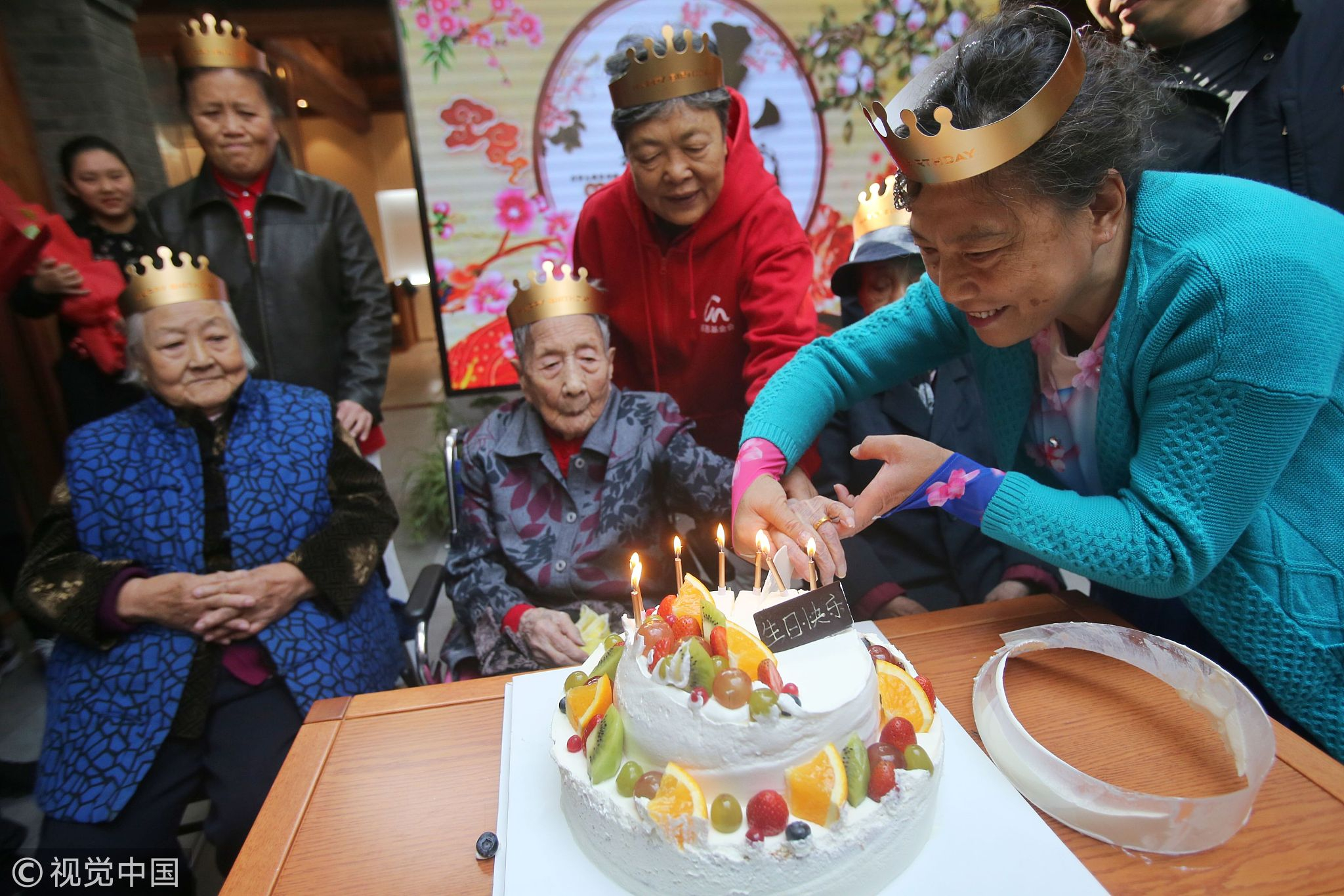 A birthday party organized for several senior citizens at a community center, Beijing, China, October 12, 2018 /VCG Photo