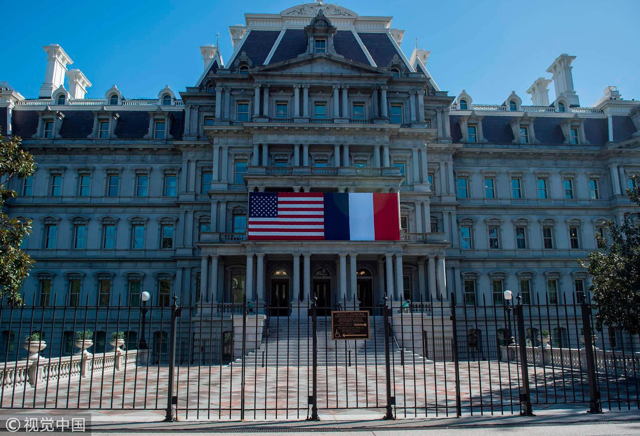 The US national flag and French national flag are seen on the Executive Office Building in Washington, DC, on April 20, 2018, the week before the visit of French President Emmanuel Macron. /VCG Photo