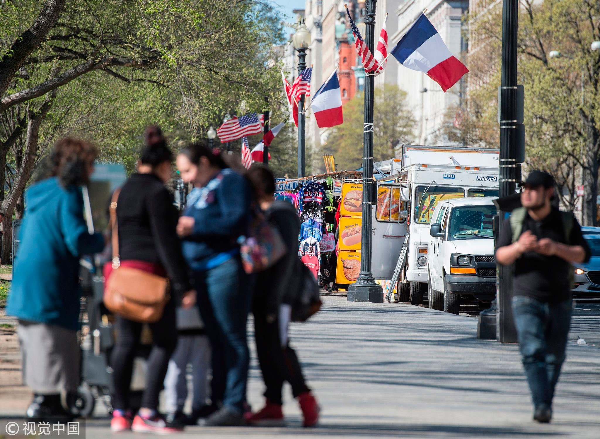 Tourists buy souvenirs near light poles with a US national flag, French national flag (C) and Washington, DC, flag flying in Washington, DC, on April 20, 2018, the week before the visit of French President Emmanuel Macron. /VCG Photo