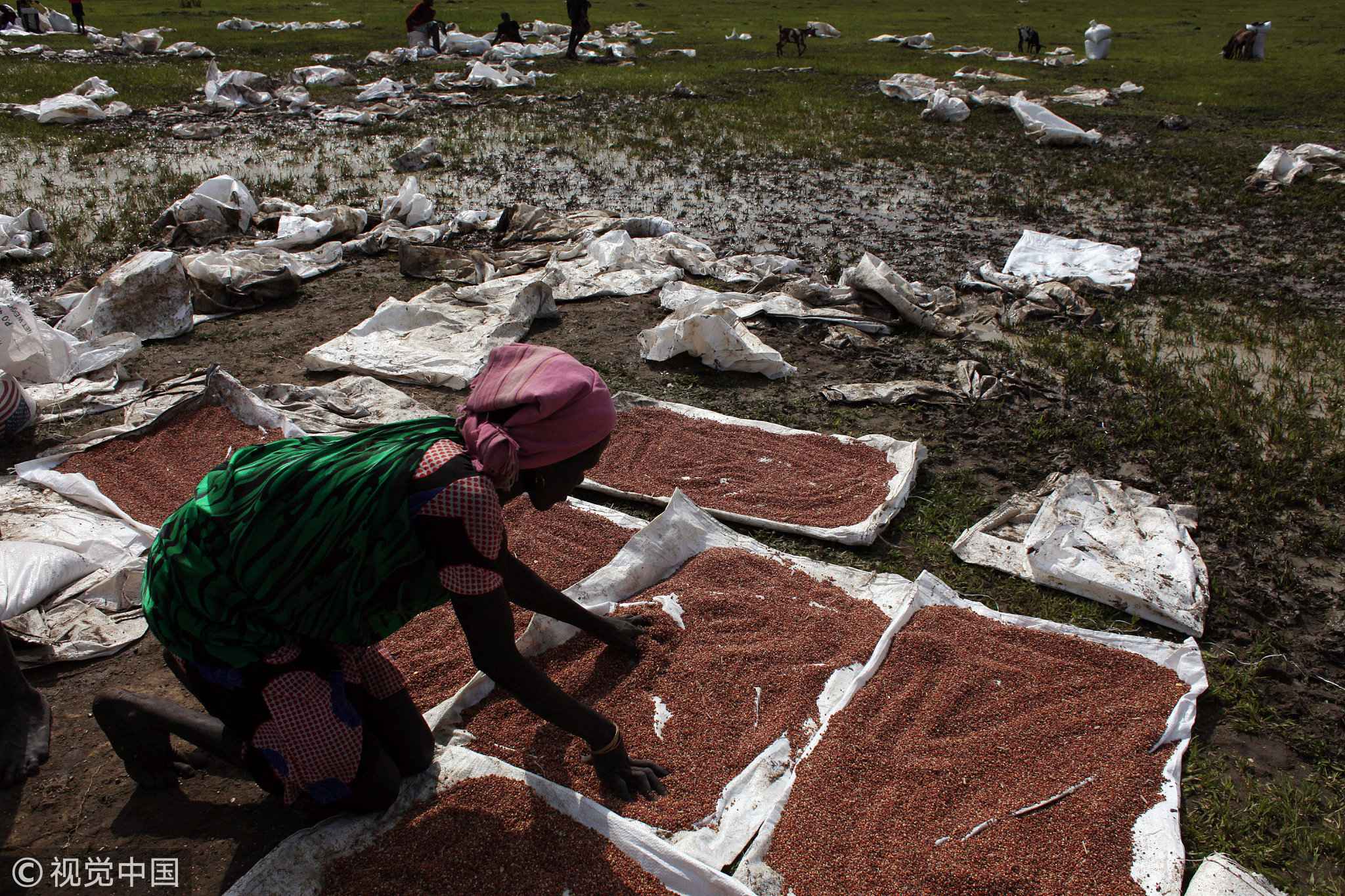 An internally displaced woman sorts grain at a food distribution by the World Food Programme in the Sudd Swamp near the town of Nyal, in South Sudan, Aug. 19, 2018. /VCG Photo