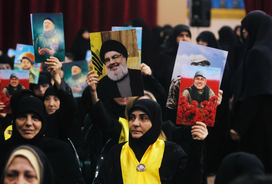 Female supporters of Lebanon's Hezbollah hold pictures of Lebanon's Hezbollah leader Sayyed Hassan Nasrallah and Hezbollah commander Mustafa Badreddine, who was killed in an attack in Syria, as Lebanon's Hezbollah leader Sayyed Hassan Nasrallah addresses his supporters in Beirut, Lebanon May 14, 2018. /Reuters Photo