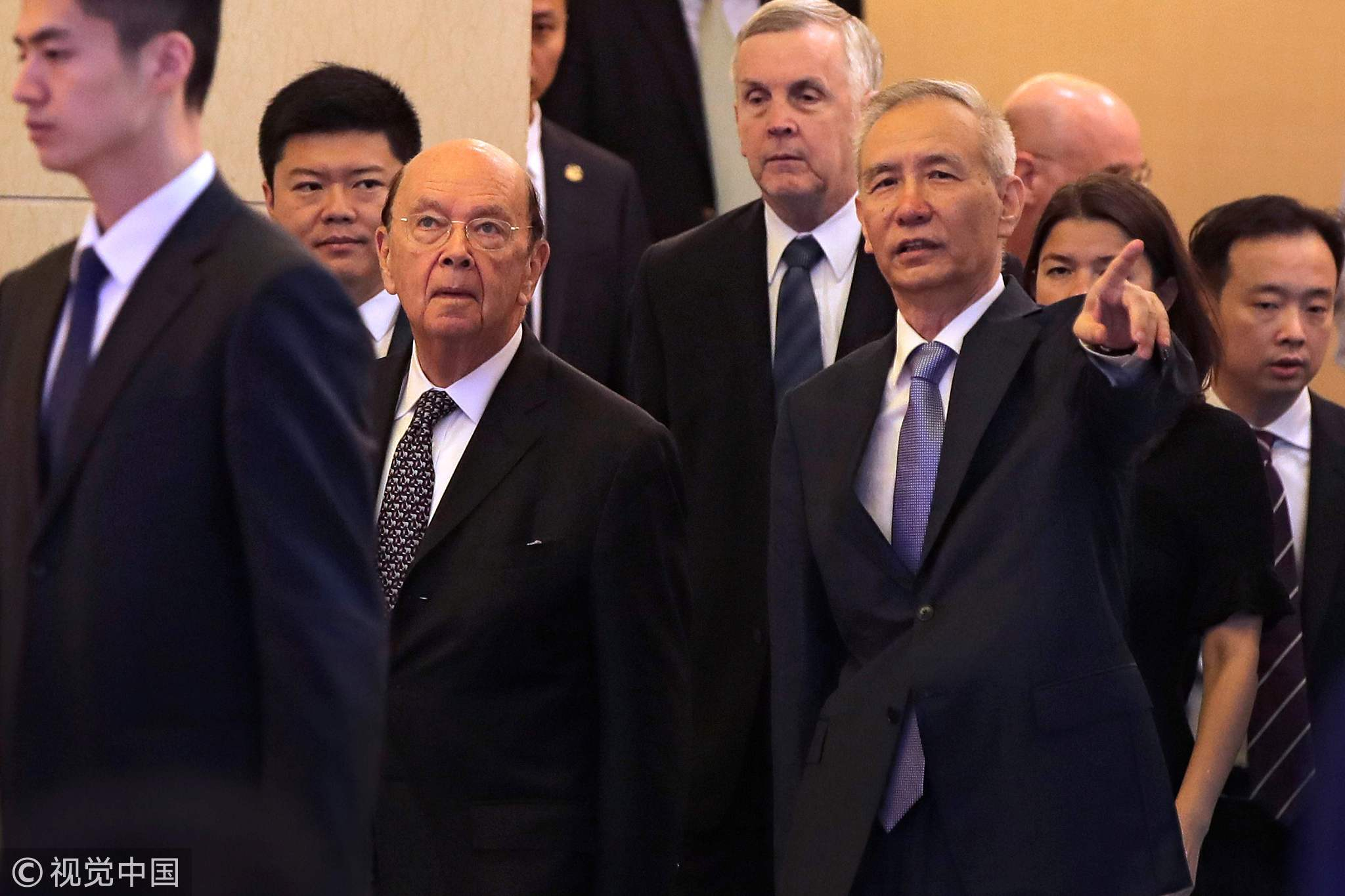 US Commerce Secretary Wilbur Ross (2nd-L) and Chinese Vice Premier Liu He (R) arrive to attend a meeting at the Diaoyutai State Guesthouse in Beijing on June 3, 2018. /VCG Photo