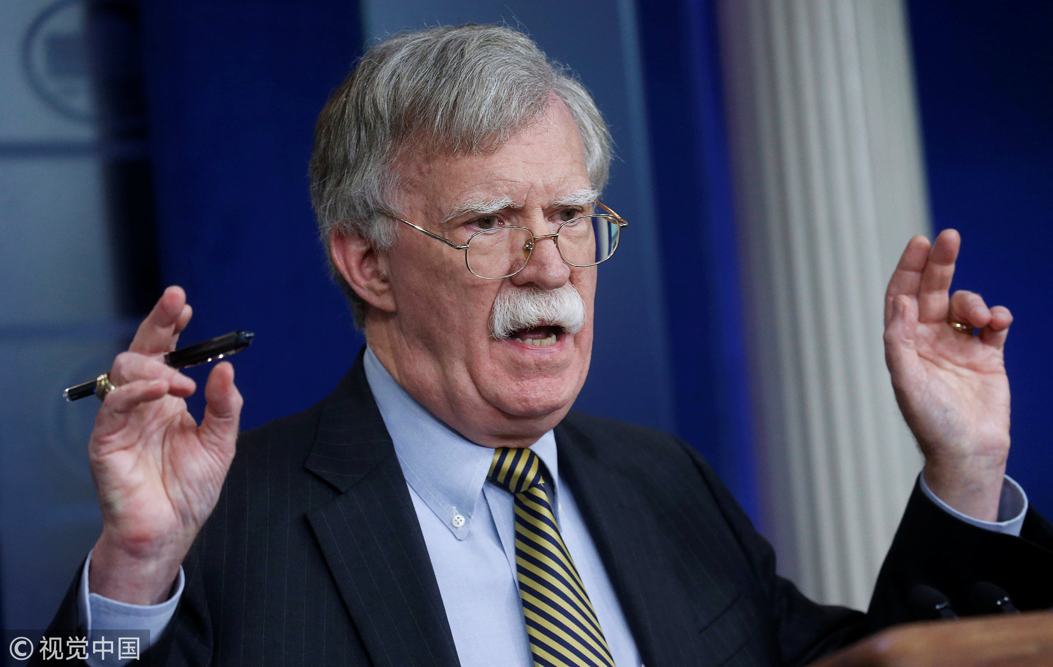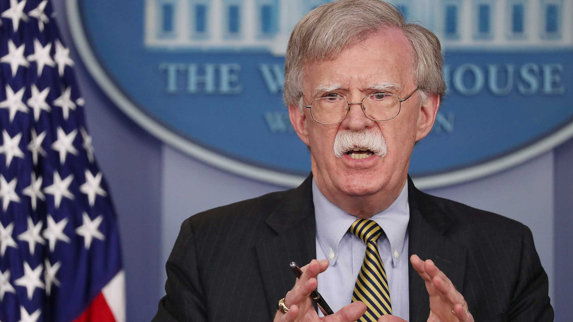 US National Security Adviser John Bolton answers a question from a reporter about how he refers to Palestine during a news conference in the White House briefing room in Washington, US, October 3, 2018. /VCG Photo