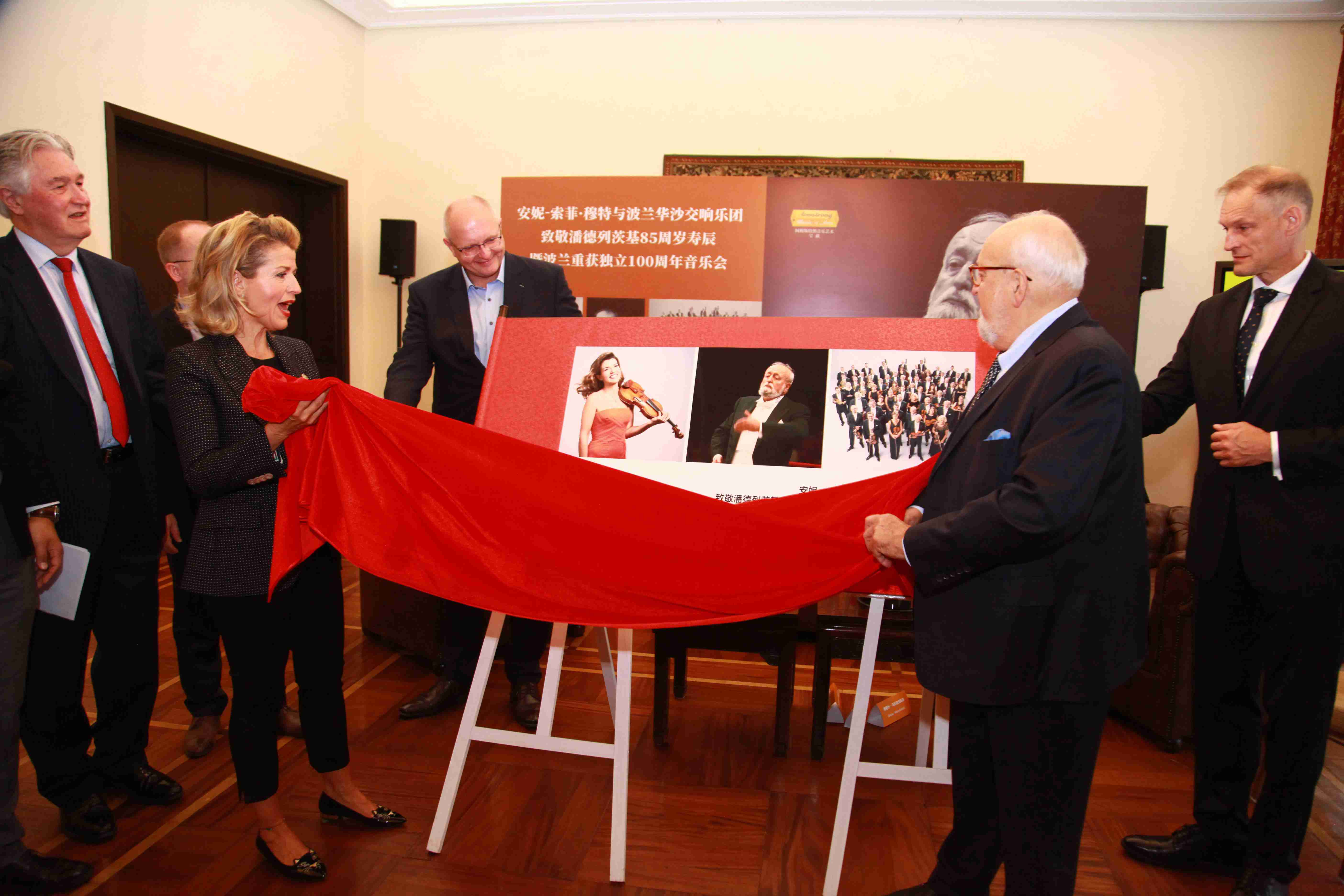 Krzysztof Penderecki, Anne-Sophie Mutter kick off the tour by unveiling the poster. /Photo via y Armstrong International Music & Arts Enterprises Ltd.