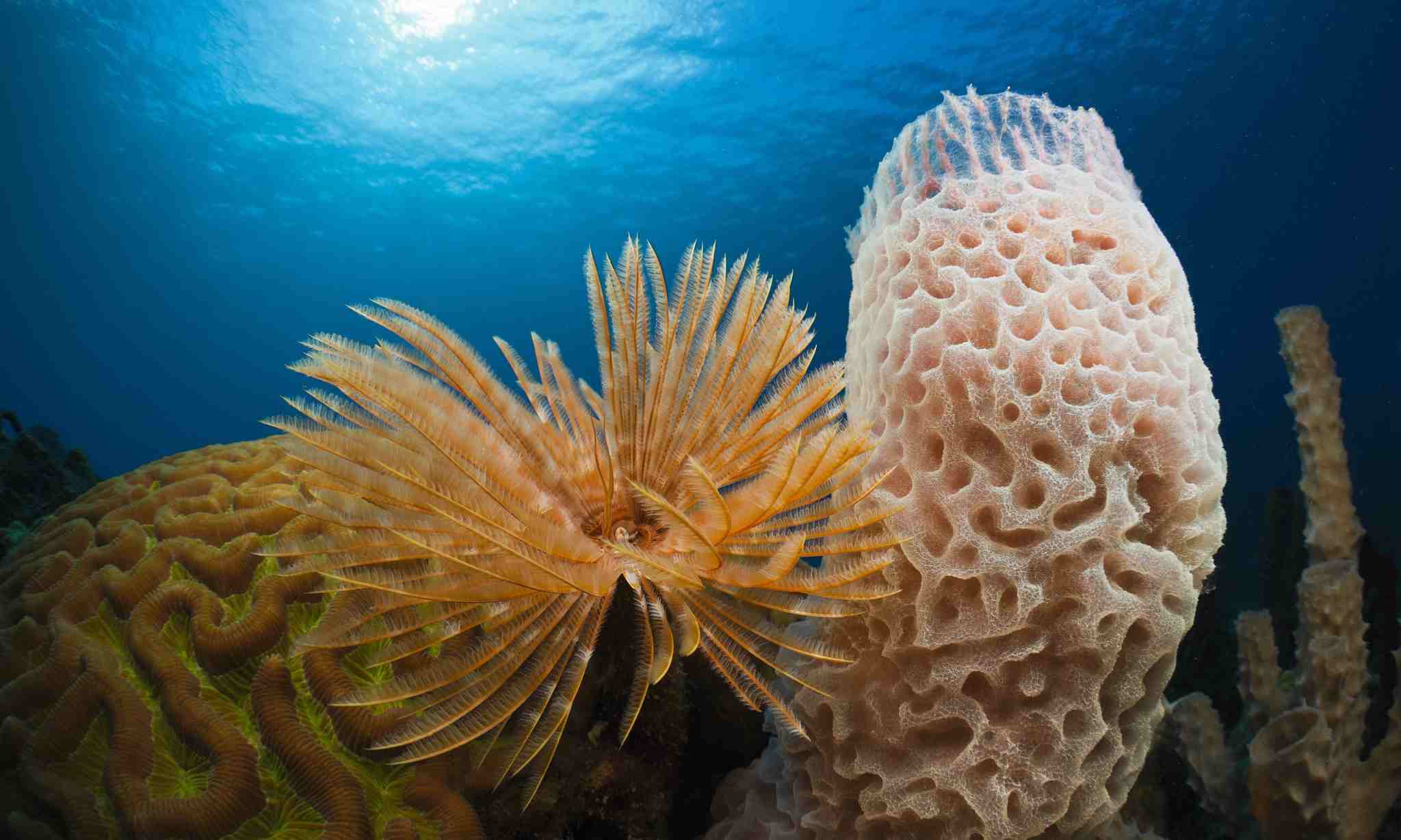 Fan worms and sponges on a coral reef in the Caribbean Sea. /VCG Photo