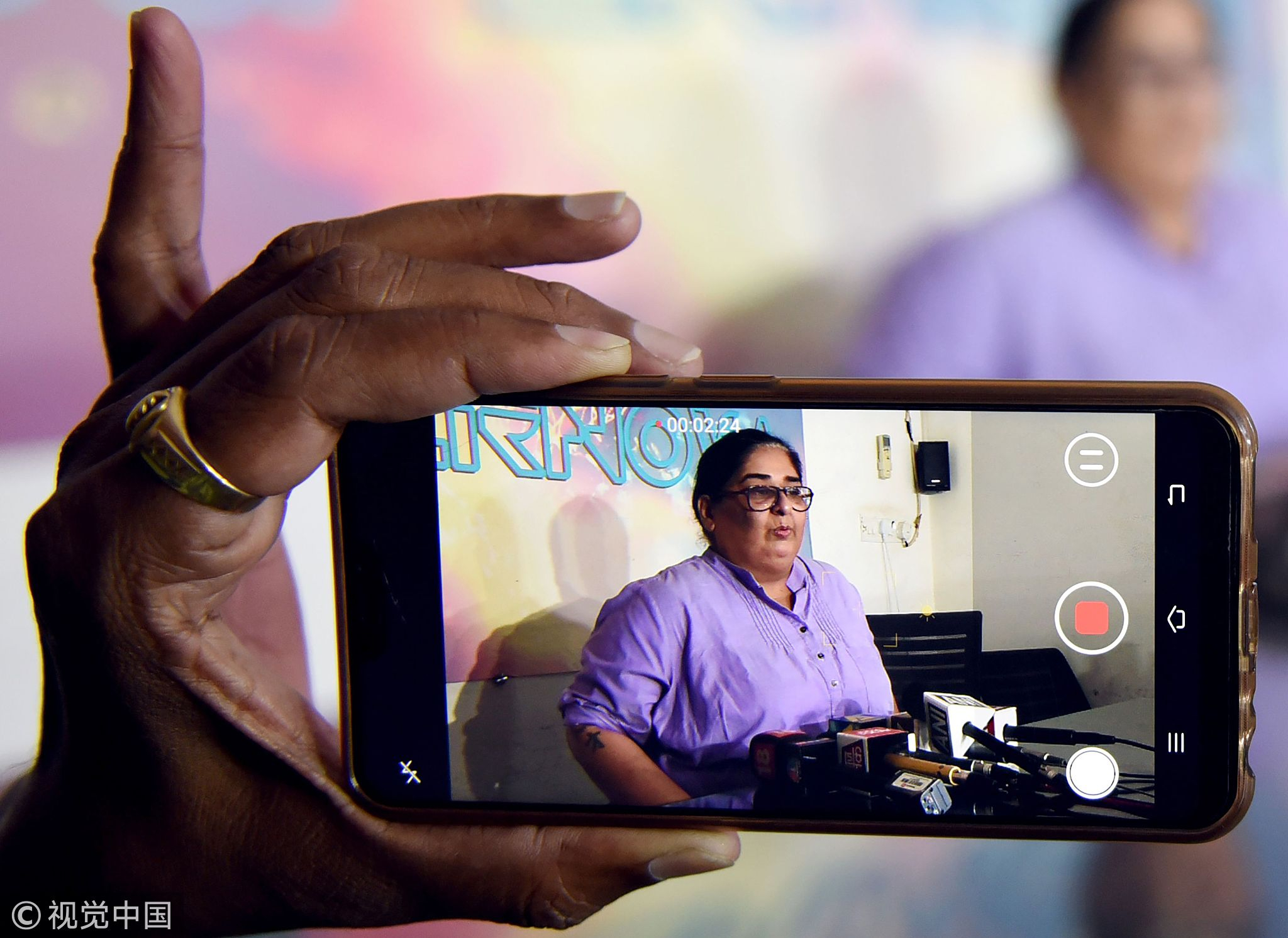 Indian Bollywood writer-producer Vinta Nanda is seen on a mobile phone screen during a press conference in Mumbai, India, October 9, 2018. /VCG Photo