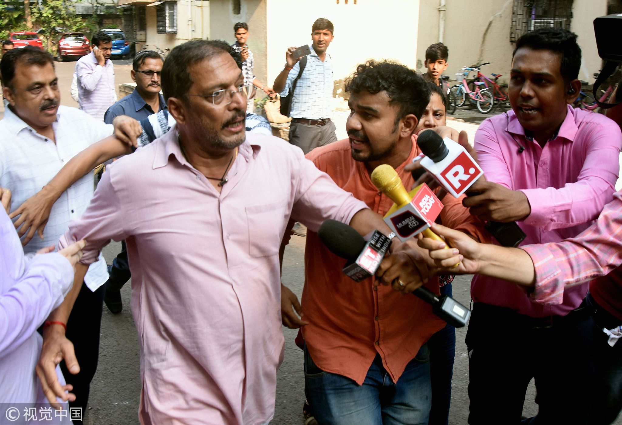 Indian Bollywood actor Nana Patekar is mobbed by the media outside his home in Mumbai, India, October 8, 2018. /VCG Photo