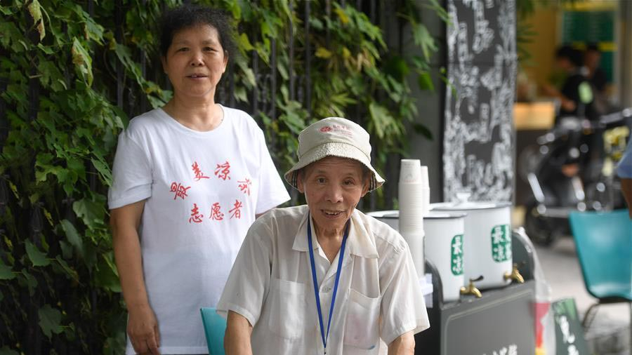 Gu Zhonggen, an 80-year-old herbal tea vendor, runs a streetside herbal tea stand in Hangzhou City, east China's Zhejiang Province. Every year, during the hottest days of summer, he hands out free cups of herbal tea to passersby. It has been a family tradition Gu has held for more than 40 years.