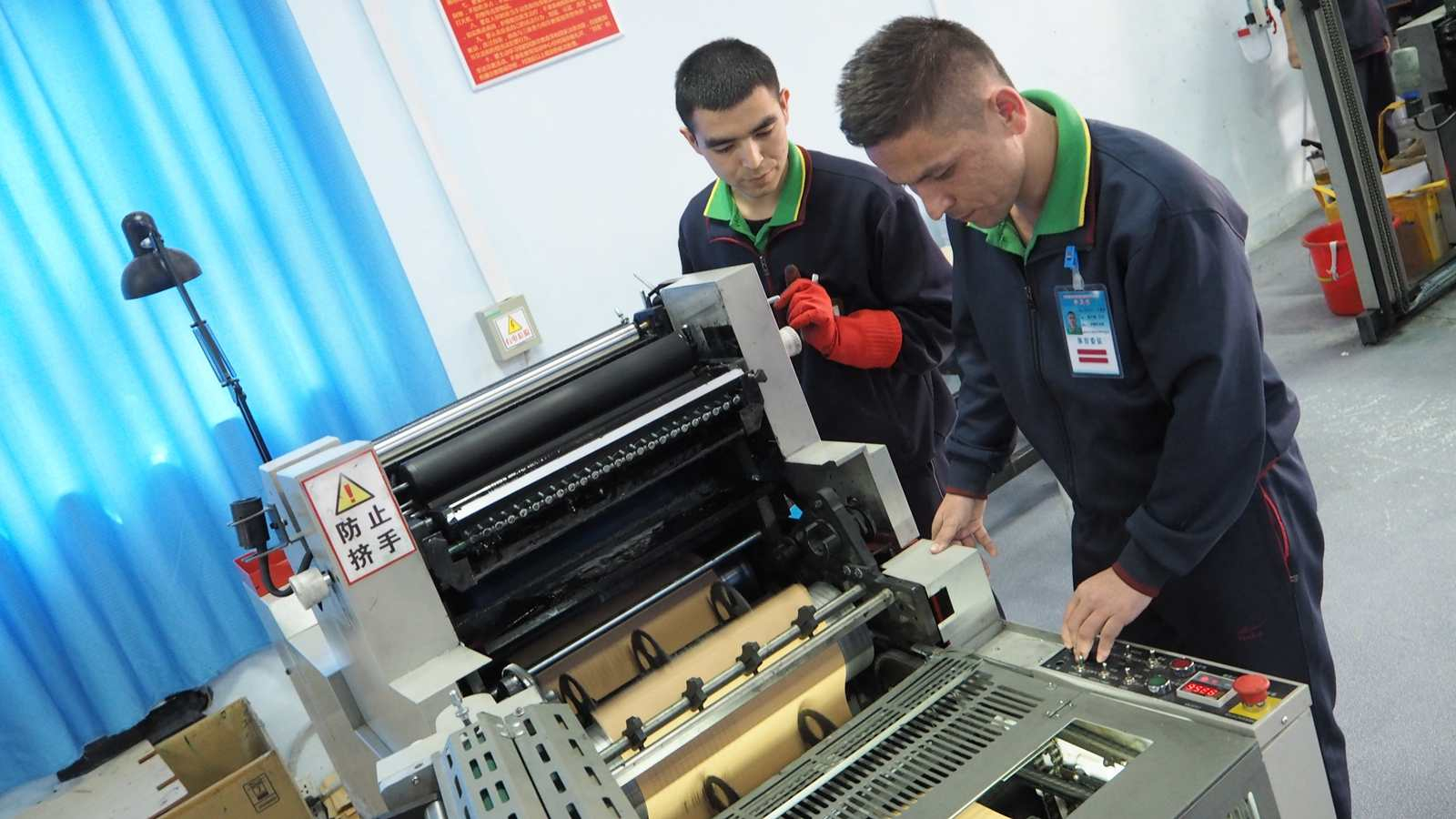 Trainees learn to operate a printing machine at an educational and vocational training center in Yutian County, Hotan, Xinjiang Uygur Autonomous Region, NW China. /CGTN Photo