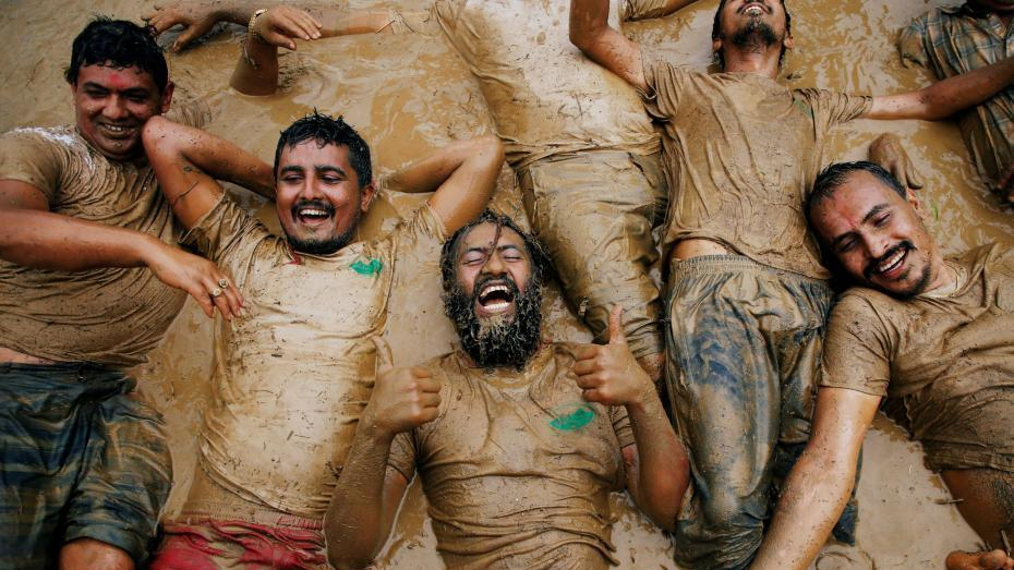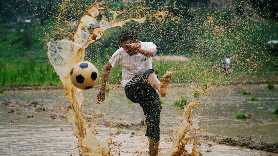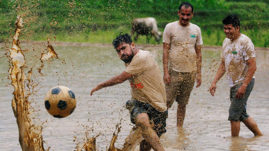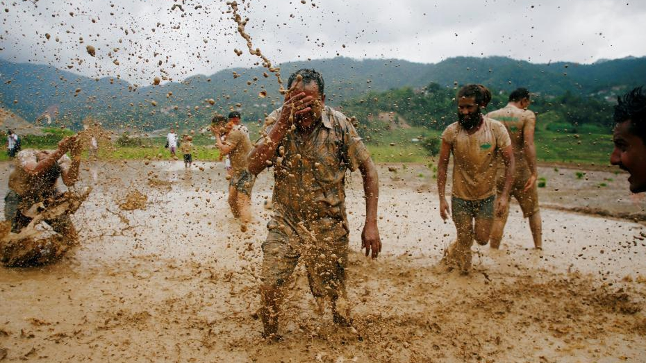 To celebrate the annual agricultural festival of Asar Pandra, or National Paddy Day, Nepalese farmers played soccer and soaked themselves in water and mud in central Nepal’s village of Lele. /Chinanews Photo