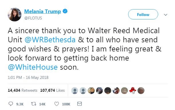 “Great to have our incredible First Lady back home in the White House,” Trump wrote. “Melanie is feeling and doing really well. Thank you for all of your prayers and best wishes!”