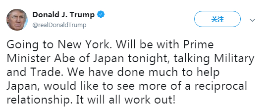 Trump had tweeted: “Going to New York. Will be with Prime Minister Abe of Japan tonight, talking Military and Trade. We have done much to help Japan, would like to see more of a reciprocal relationship. It will all work out!”