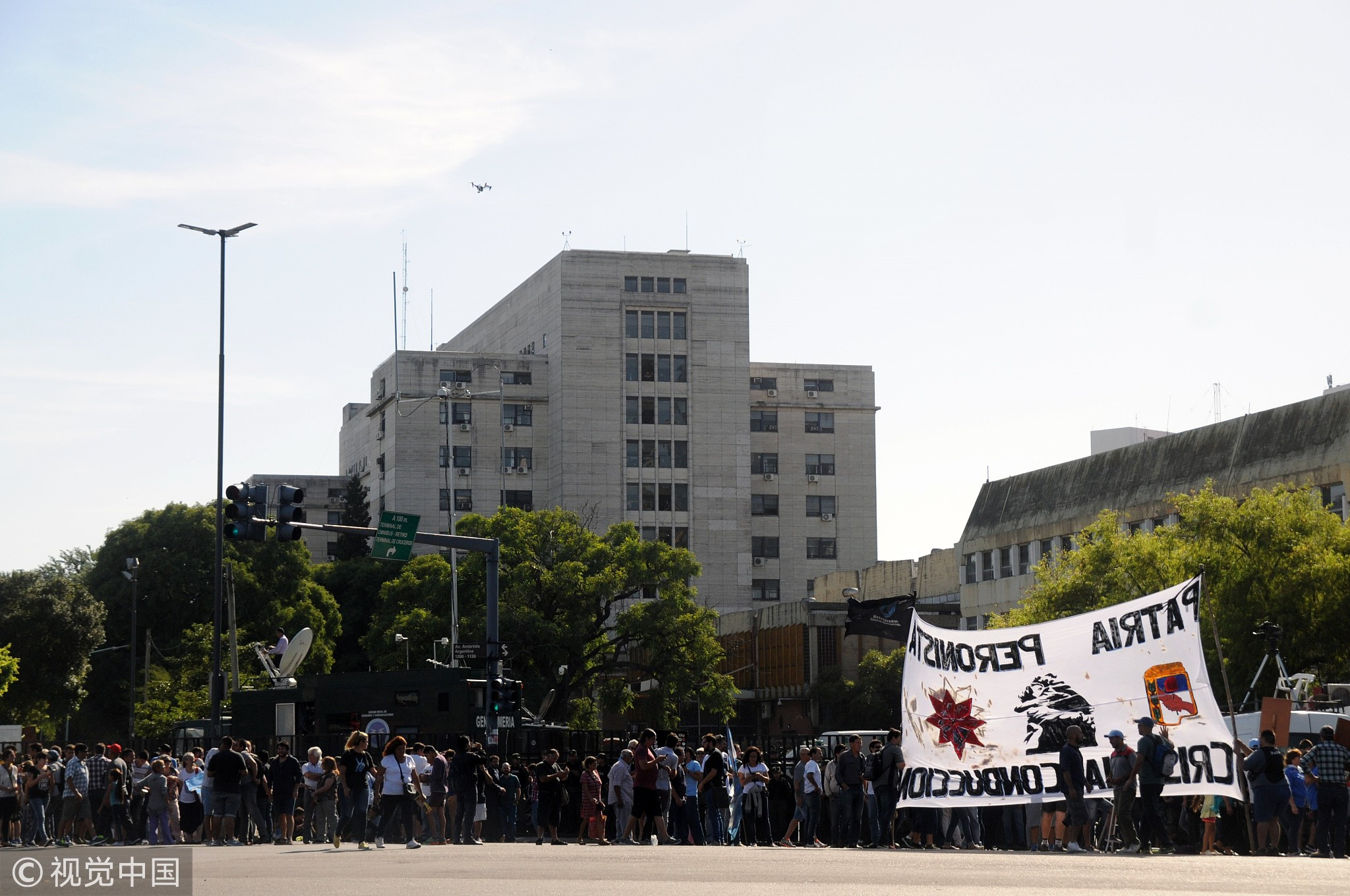 Protesters wait the arrival of former Argentine president Cristina Kirchner to Comodoro Py Courthouse for a hearing related to "Los Sauces" commercial company in Buenos Aires, March 7, 2017. /VCG Photo