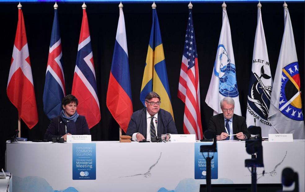 Finnish Foreign Minister Timo Soini (C) speaks during the Arctic Council summit at the Lappi Areena in Rovaniemi, Finland, May 7, 2019. /Reuters Photo