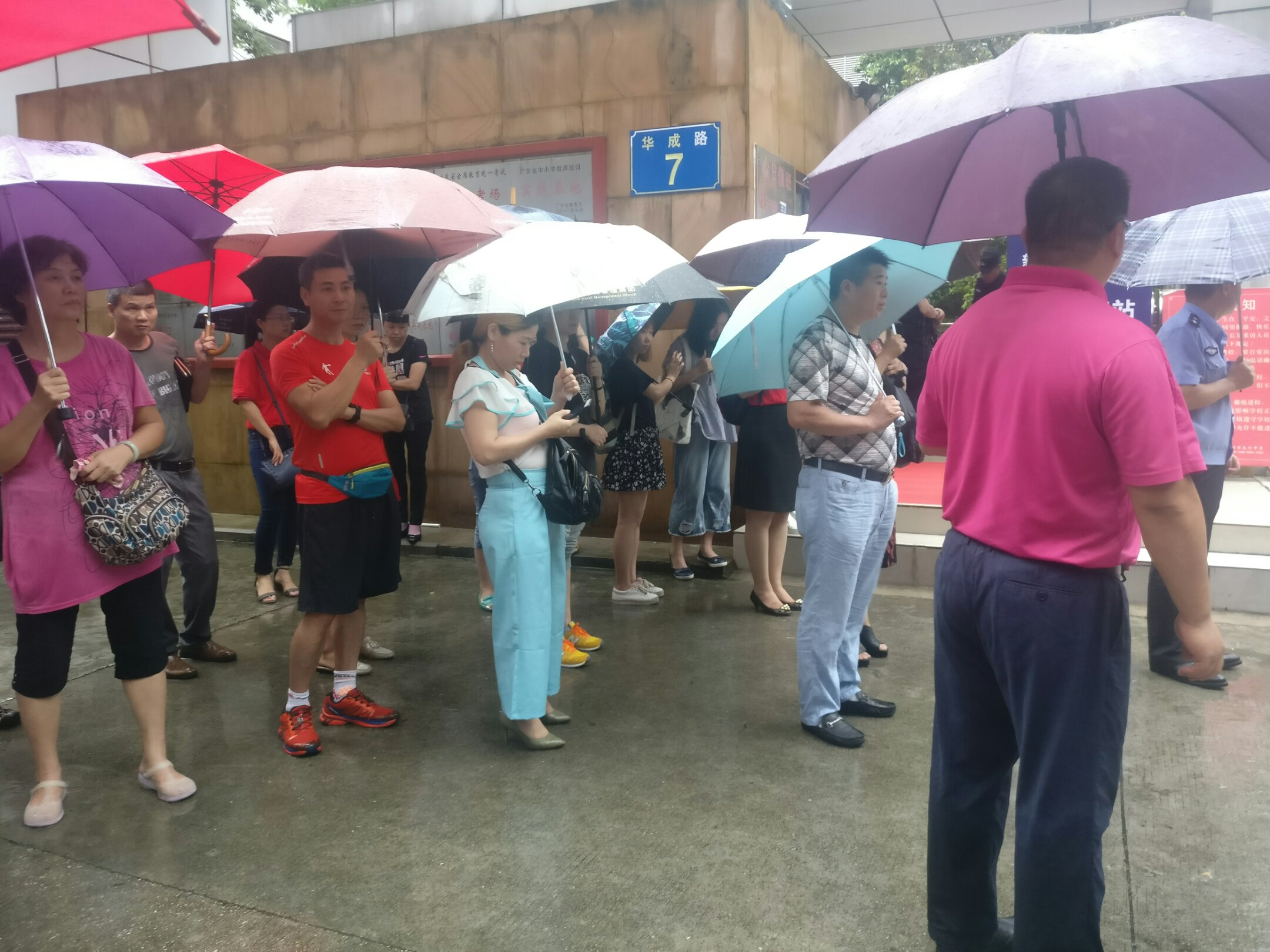Parents wait outside a test center in Guangzhou on Thursday. /CGTN Photo