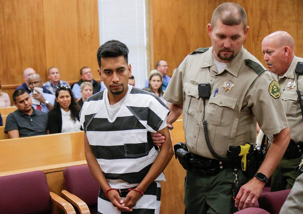 Cristhian Rivera, 24, accused of killing University of Iowa student Mollie Tibbetts, is led from the courtroom after making his initial appearance on a charge of first-degree murder at the Poweshiek County Courthouse in Montezuma, Iowa, August 22, 2018. /VCG Photo