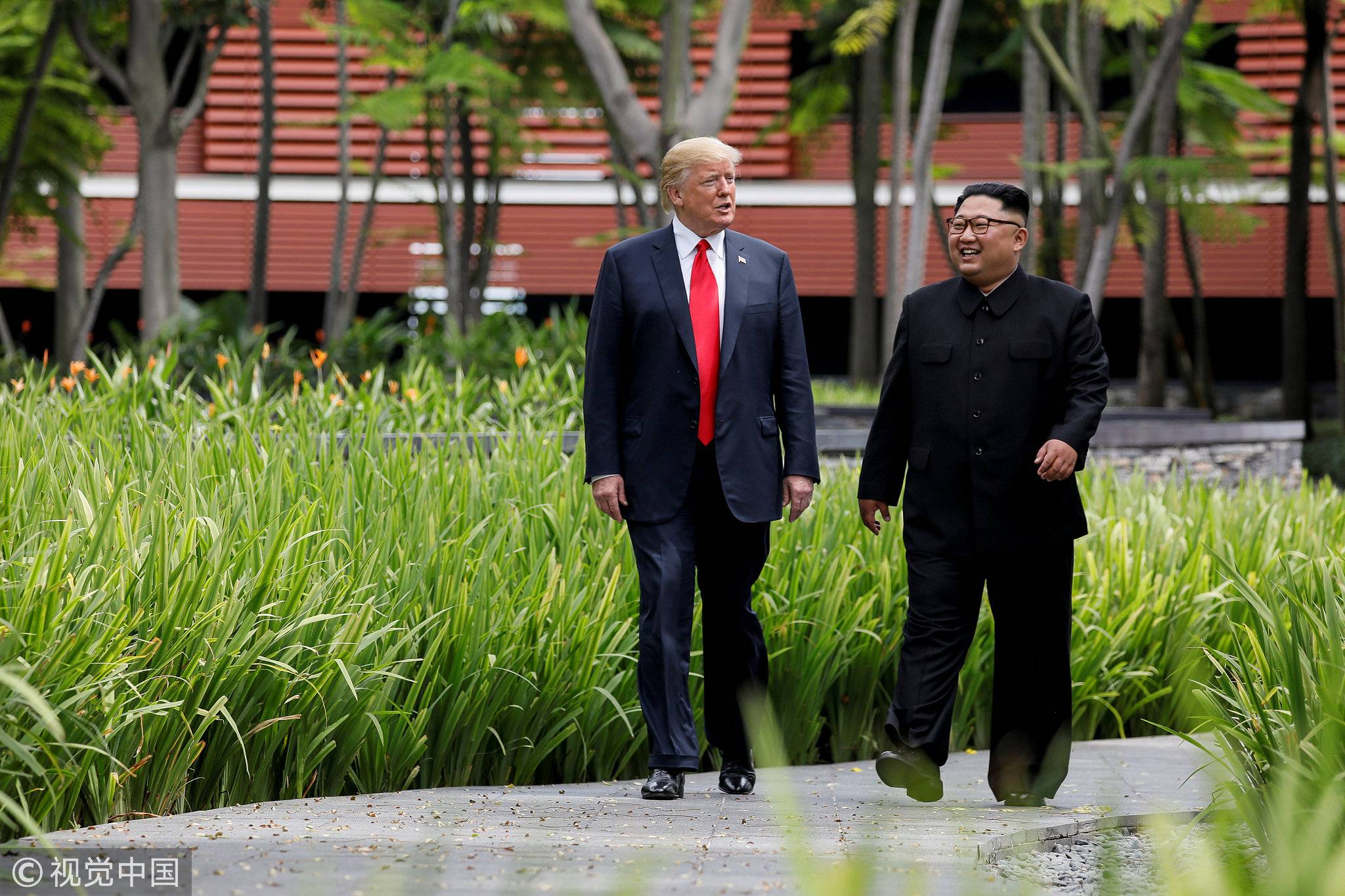 US President Donald Trump and DPRK leader Kim Jong Un walk together before their working lunch during their summit at the Capella Hotel on the resort island of Sentosa, Singapore on June 12, 2018. /VCG Photo