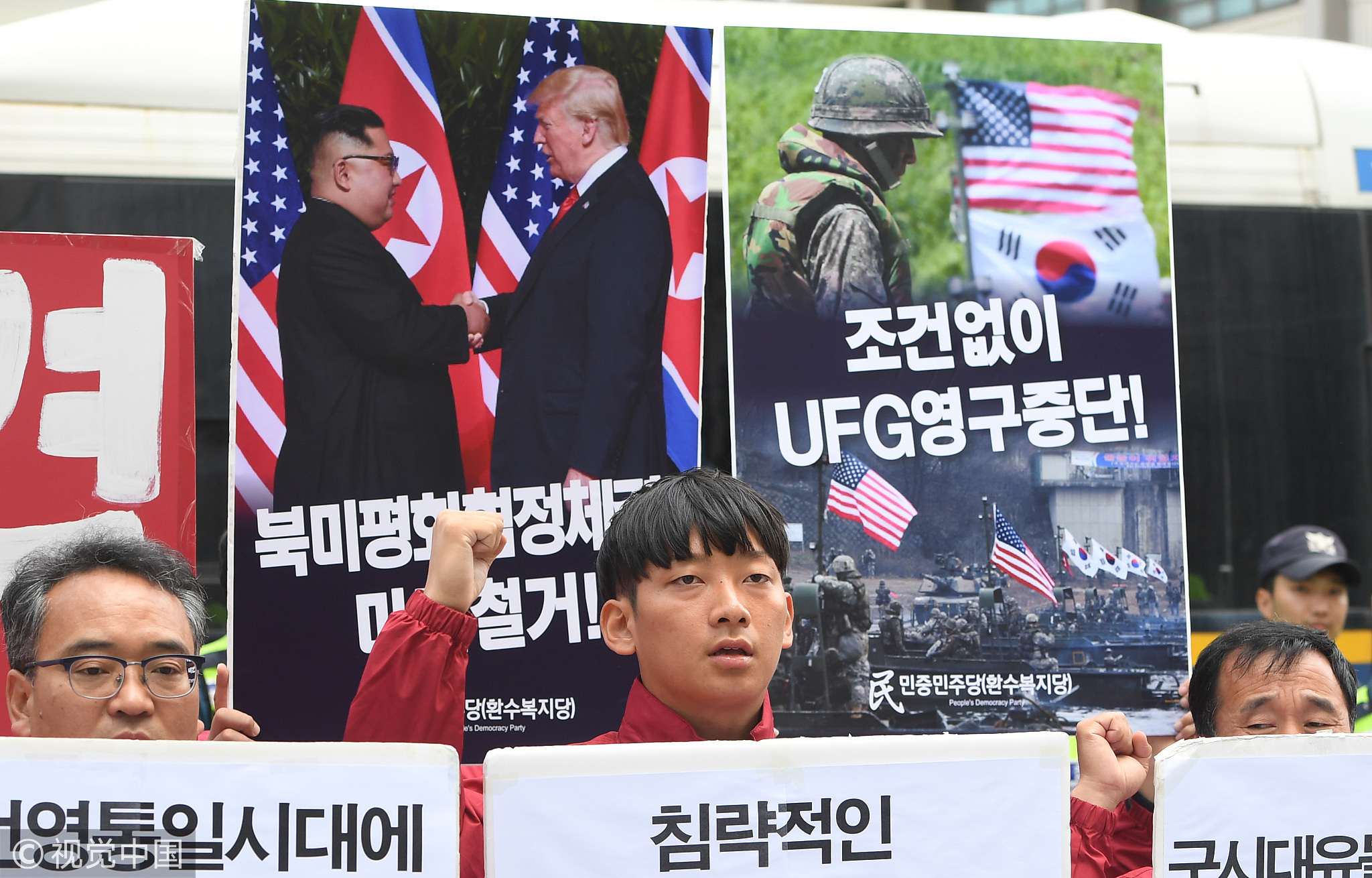 ROK activists hold placards showing images of the Trump-Kim summit (L) and a ROK-US joint military drill (R) during a rally to demand a halt to the Ulchi Freedom Guardian (UFG), a joint computer-simulated military exercise, near the US Embassy in Seoul on June 15, 2018. /VCG Photo