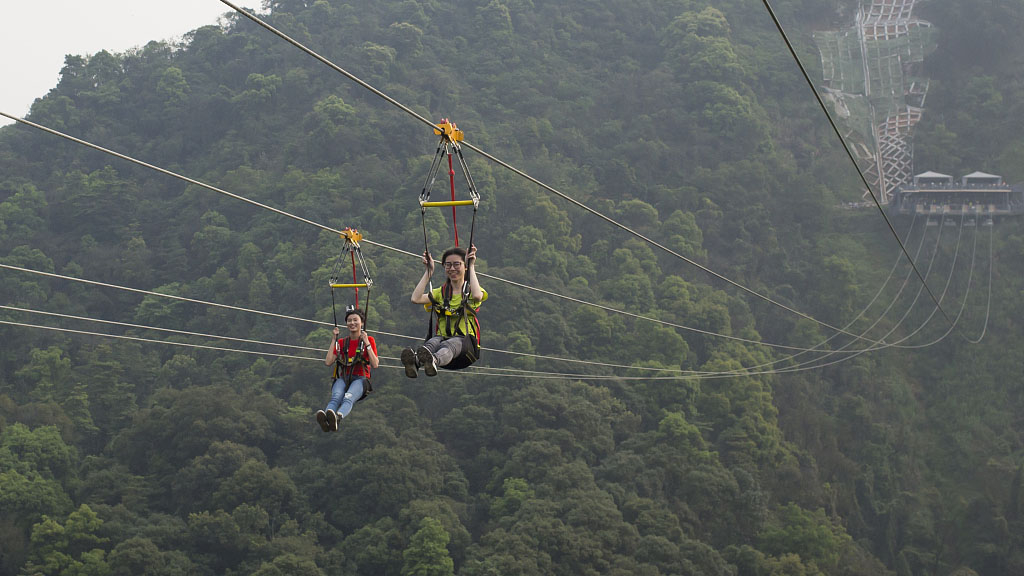 China's longest zip lines have opened to the public in the southern city of Guangzhou. The lines stretch 1,500 meters long and connect Guangdong provincial capital's Baiyun Mountain to the Huangpodong Reservoir. There are a total of six zip lines. Tourists need to take a weigh-in before being assigned to the suitable zip lines, according to their weights. Visitors can reach speeds of up to 120 km/h and the thrilled journey takes only two minutes, which takes around an hour on foot.