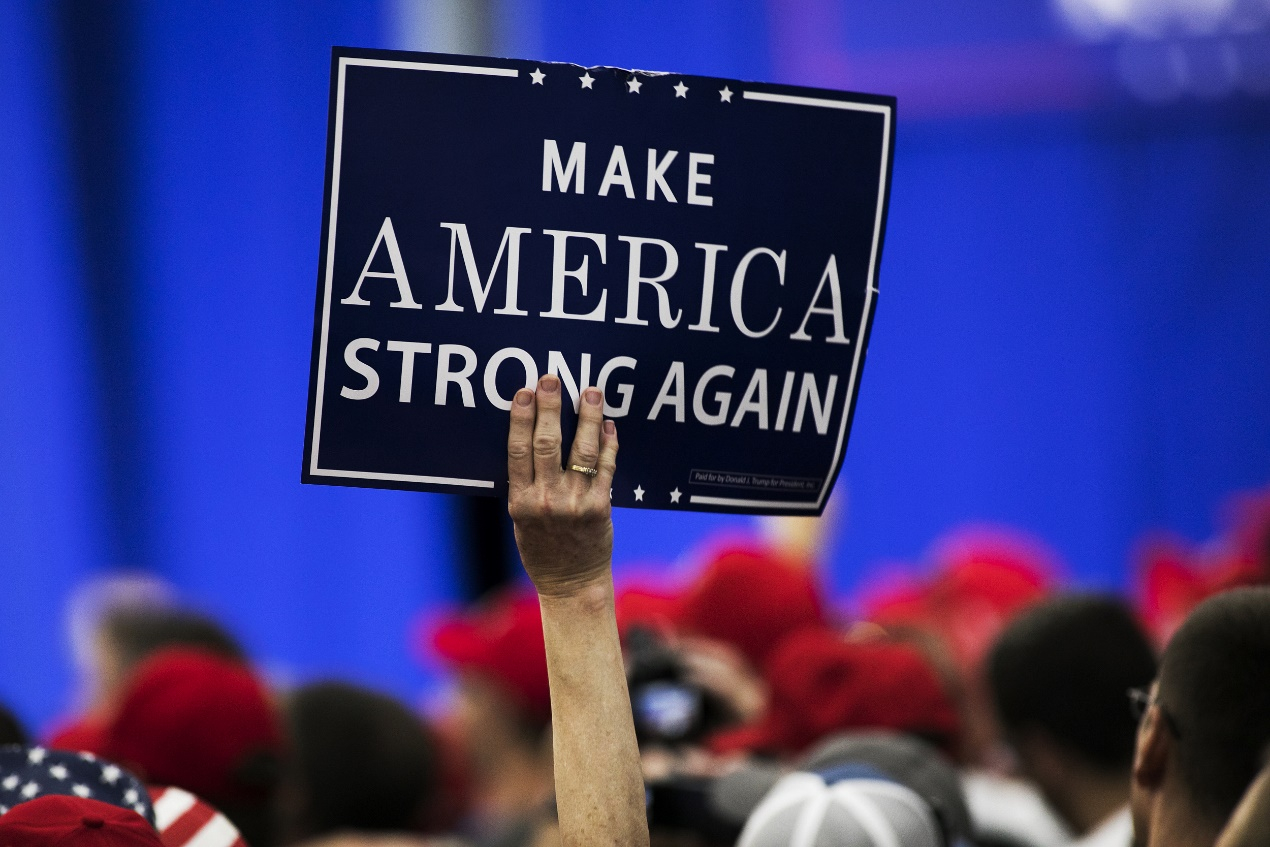 A person holds slogan at Trump’s “Make America Great Again (MAGA)” rally, August 4, 2018. /VCG Photo