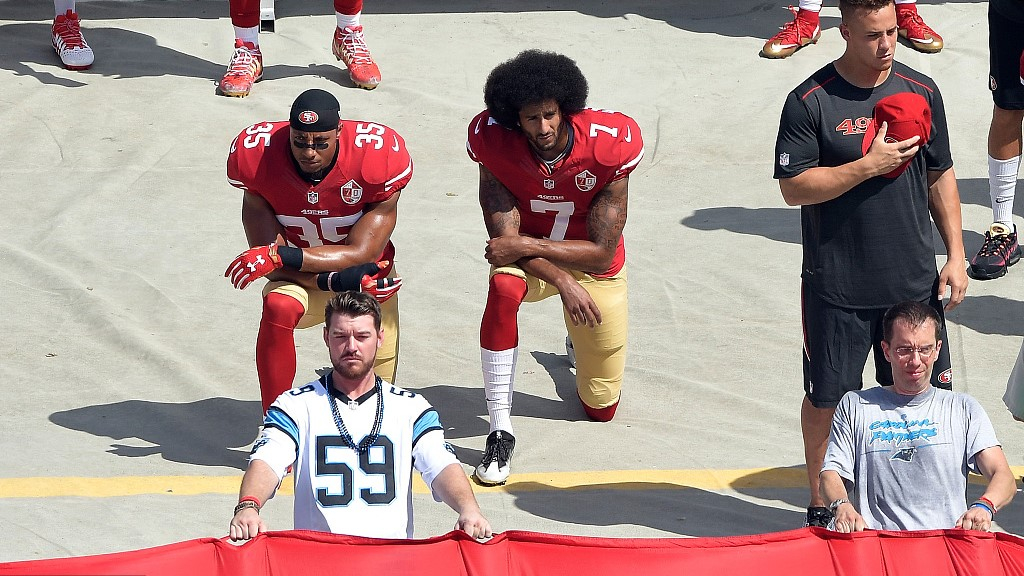 Colin Kaepernick #7 and Eric Reid #35 of the San Francisco 49ers kneel during the national anthem before their game against the Carolina Panthers at Bank of America Stadium, September 18, 2016. /VCG Photo