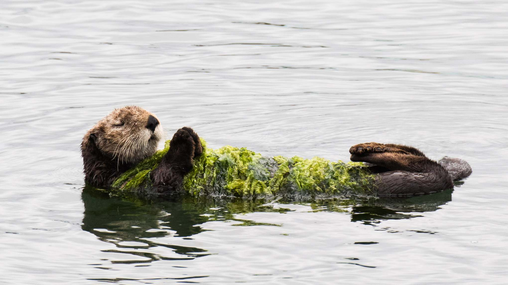 A sea otter seen floating down a harbor gets some sleep with a makeshift seaweed blanket it has pulled over itself in California, US. /VCG Photo