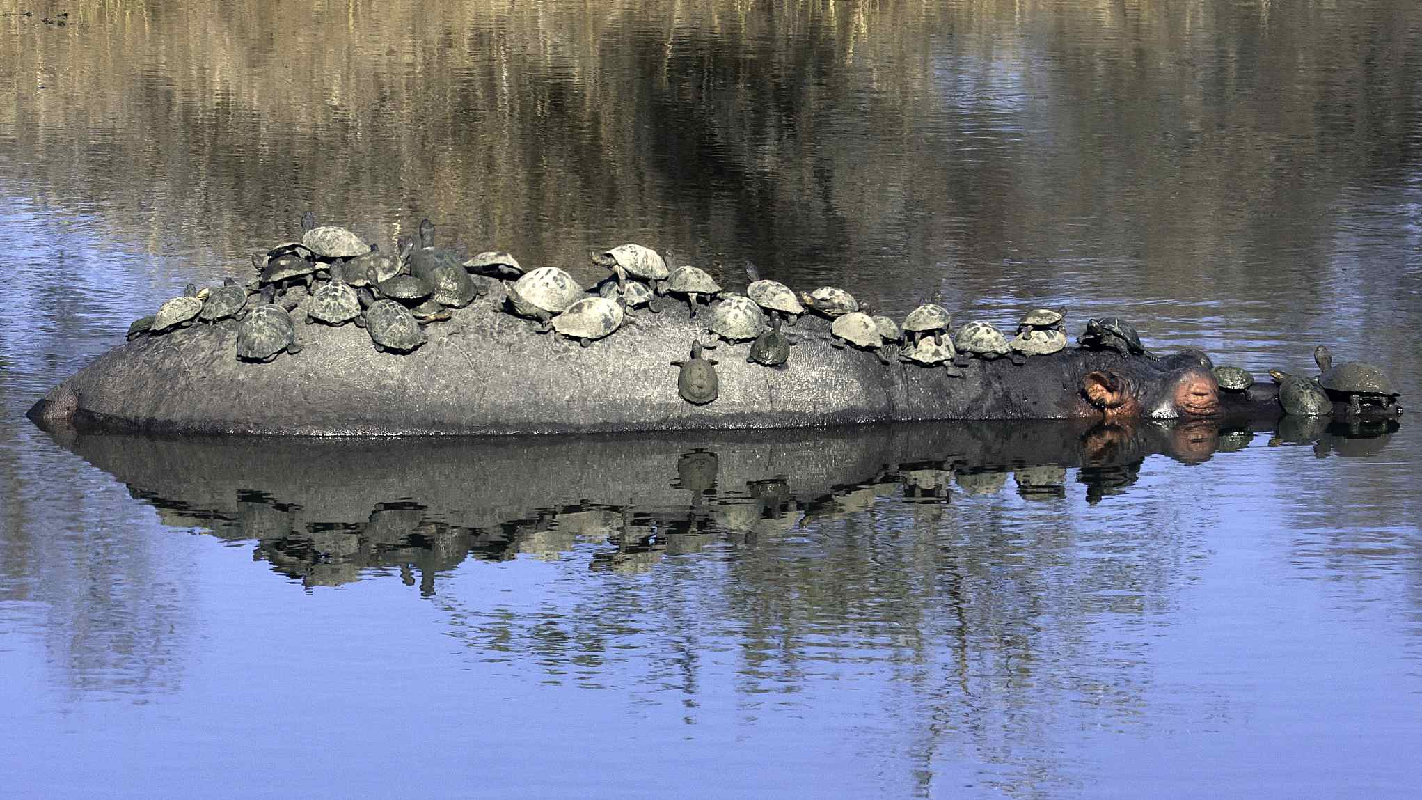 Dozens of terrapins sit on the back of a sleeping hippo in Kruger National Park, South Africa. /VCG Photo